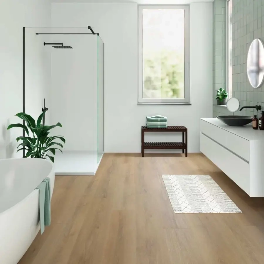 Wodoodporne panele laminowane:Współczesne panele laminowane nowej generacji coraz częściej pojawiają się w łazienkach, stanowiąc alternatywę dla winylu. Jest to możliwe dzięki zastosowaniu zaawansowanej technologii hydrofobowej, opartej na płycie HDF o ekstremalnie wysokiej gęstości oraz fabrycznej impregnacji zamków specjalnymi preparatami na bazie wosku lub żywic. Takie rozwiązanie jest idealne, gdy priorytetem jest zachowanie jednolitej podłogi w całym domu – pozwala na płynne przejście z salonu do łazienki bez konieczności zmiany wzoru. Należy jednak pamiętać, że warunkiem koniecznym jest wybór produktu, na którym producent wyraźnie zaznaczył możliwość montażu w pomieszczeniach mokrych. Ograniczenia czasowe: Warto jednak pamiętać o kluczowym parametrze – ochronie czasowej. Większość laminatów wodoodpornych gwarantuje szczelność tylko przez określony czas, zazwyczaj od 24 do 72 godzin. Oznacza to, że jeśli woda (np. z nieszczelnej pralki) pozostanie na podłodze dłużej lub wniknie pod listwy przyścienne, rdzeń panelu może ostatecznie zacząć chłonąć wilgoć. W przypadku laminatów kluczowe jest więc szybkie reagowanie na wszelkie rozlania. |