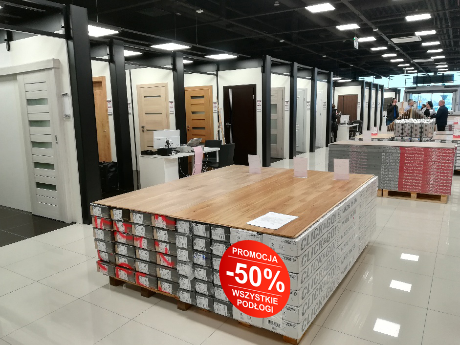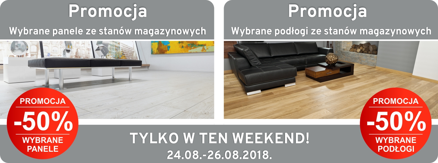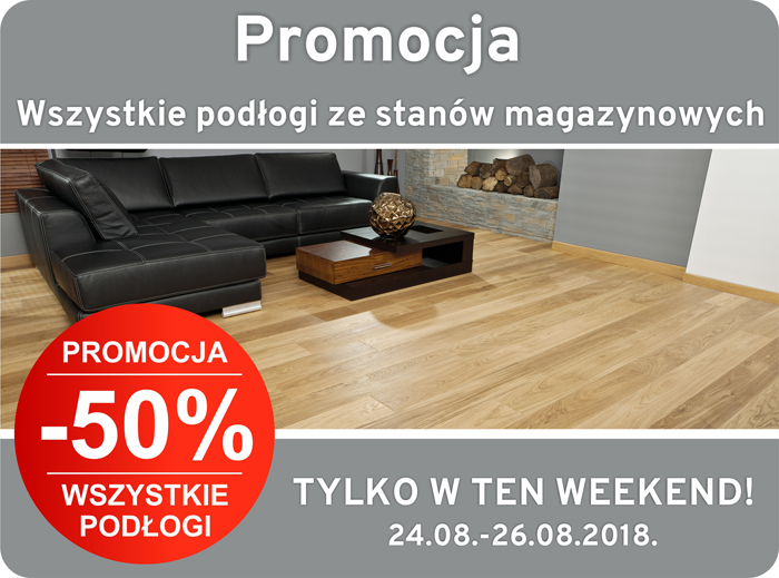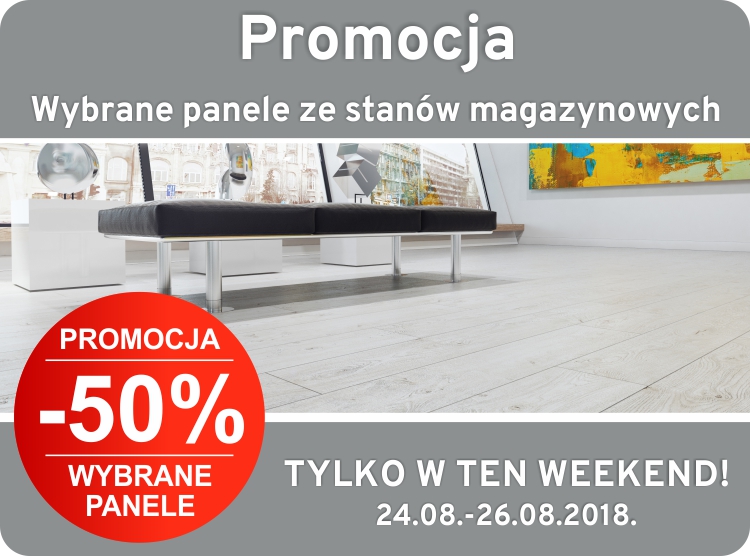 Promocja -50% na wybrane panele podłogowe i podłogi dostępne na stanie magazynowym sklepu, obowiązuje wyłącznie przy zakupie również: podkładu pod panele lub podłogi i listew przypodłogowych.
