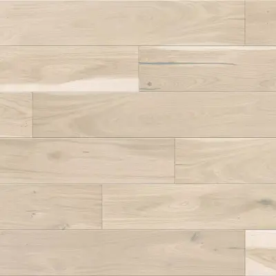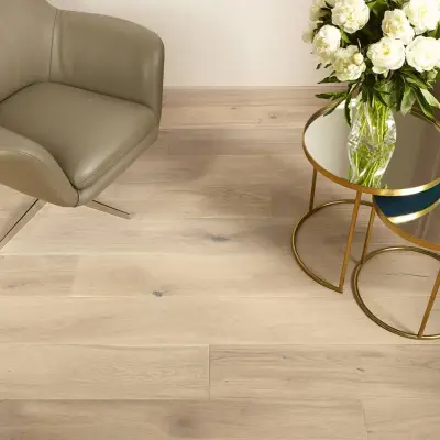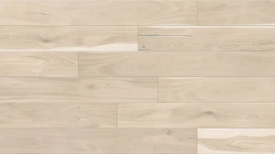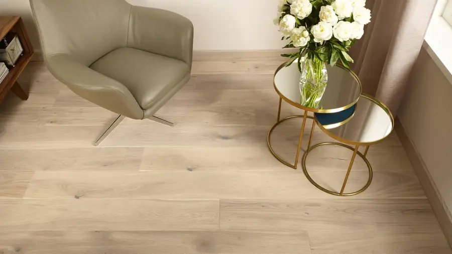 Podłoga w odcieniach bieli o strukturze drewna podkreślonynym szczotkowaniem. Deski z wyraźnie ściętymi krawędziami (fazowanie) wykończone olejowaniem.