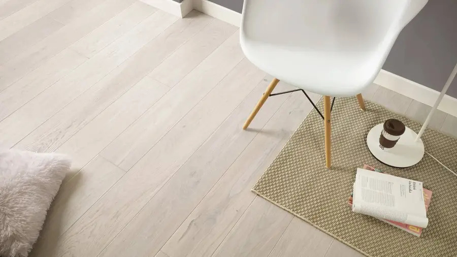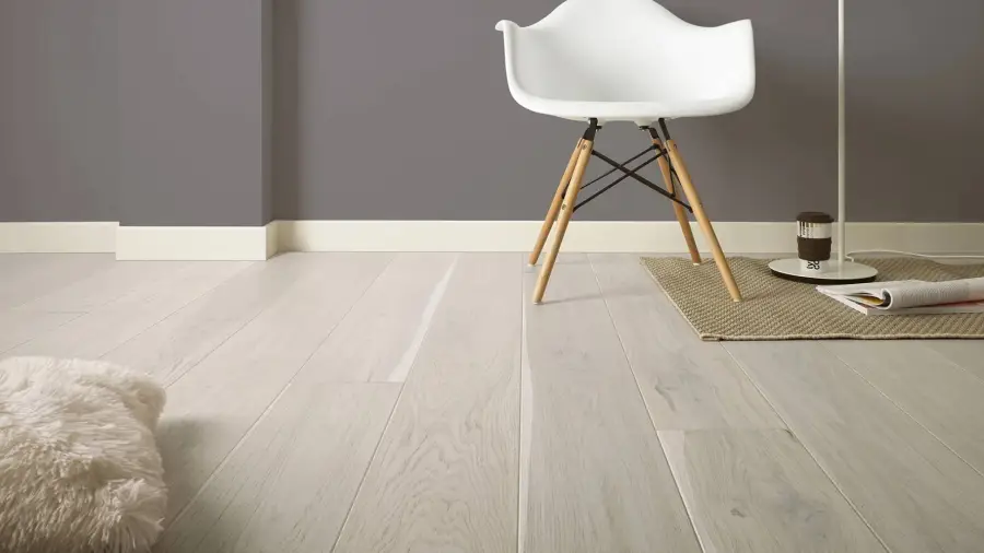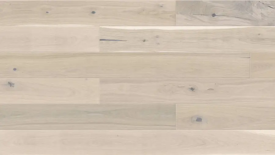 Podłoga żywotna i odporna o delikatym, kremowo-białym barwieniu. Zastosowanie szczotkowania i optycznego wydłużenia w procesie fazowania dodatkowo uszlachetniają deski.