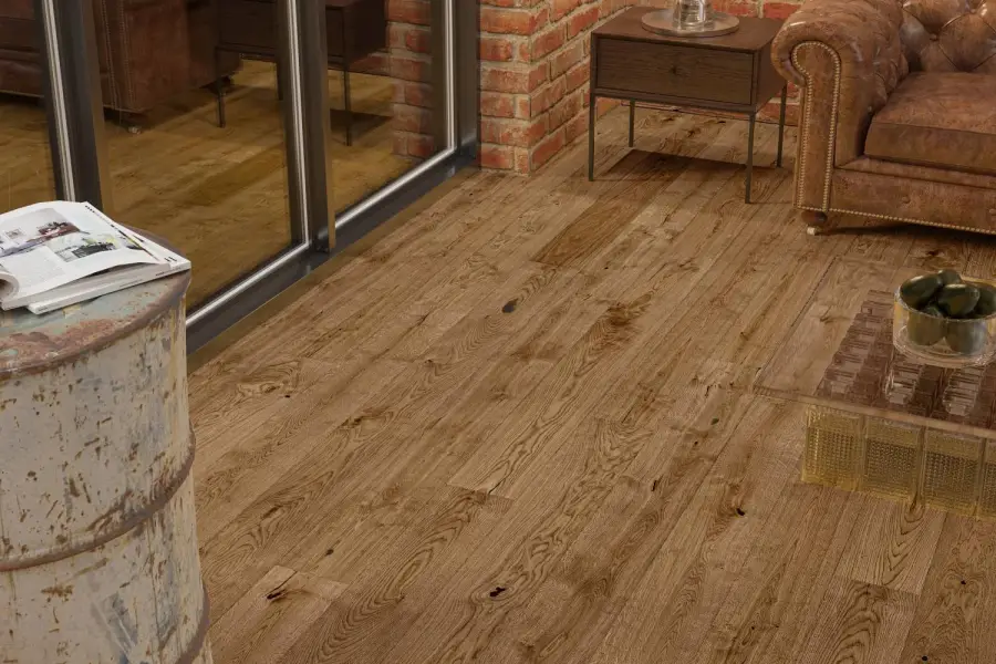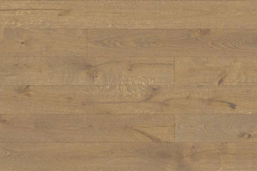 Deska dębowa w barwie żółtobrązowej z wyrazistym, naturalnym usłojeniem i zróżnicowaną kolorystyką. Podłoga została zabarwiona na elegancki odcień brązu wędzonego, który z czasem delikatnie ciemnieje pod wpływem promieni UV.