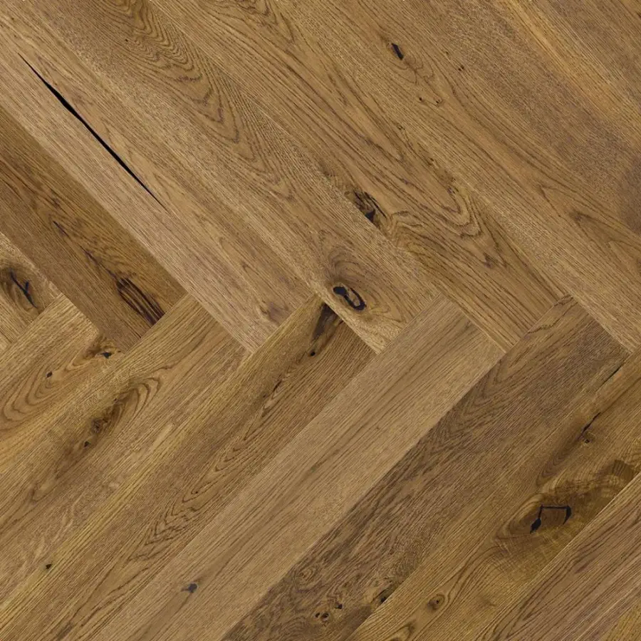 Deska dębowa o mocno wyeksponowanych cechach drewna i przyjemnym odcieniu ciepłego brązu. Podłoga poddana procesom szczotkowania i fazowania, dzięki którym zostały podkreślone struktura oraz forma. Wykończona lakierem matowym.