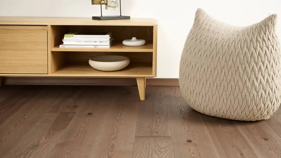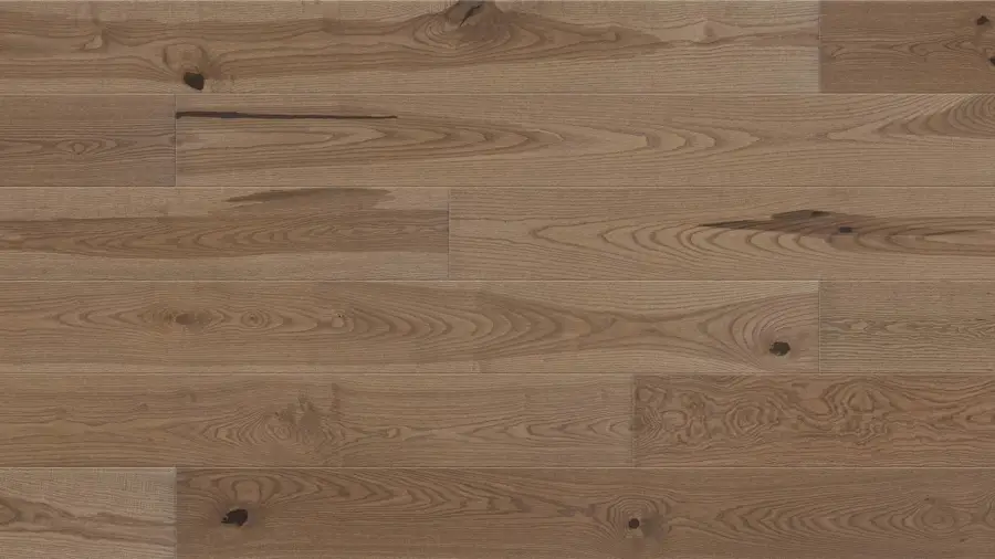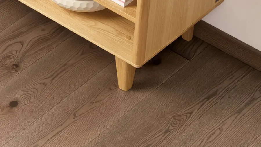 Hazelnut Grande - jesionowa deska o ciemnobrązowym zabarwieniu. Udekorowana jest rysunkiem słojów, szczotkowanie podkreśla jej naturalne cechy, a fazowanie optycznie ją wydłuża.