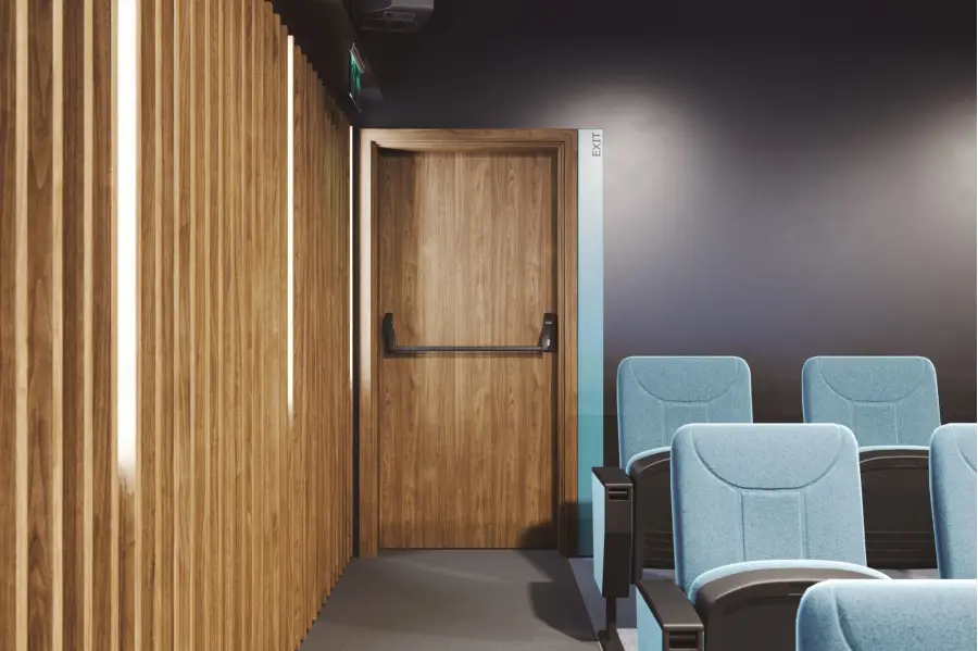 Do budynków użyteczności publicznej proponujemy komplet drzwi (skrzydło z ościeżnicą) w klasie akustycznej Rw = 42 dB , dzięki wysokim parametrom izolacji akustycznej stanowią one barierę dla niepożądanego hałasu. Drzwi o zróżnicowanym poziomie akustyki można stosować w pokojach hotelowych, biurach, salach dydaktycznych i w innych budynkach publicznych.