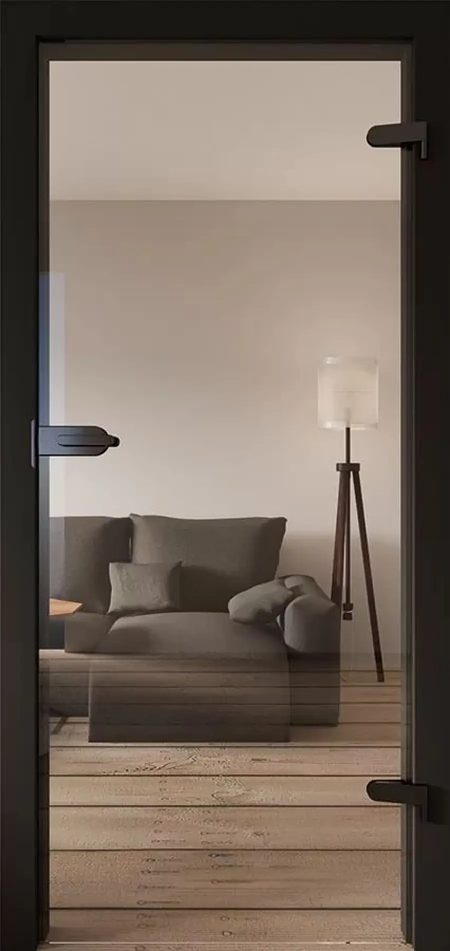 Tafla szklana wykonana z bezpiecznego szkła hartowanego wraz z otworami na mocowanie zamka i zawiasów. Grubość szkła wynosi 8 mm. Stosowane jako drzwi wewnątrzlokalowe jednoskrzydłowe z ościeżnicą regulowaną i wpółpracującego z nią skrzydła szklanego.