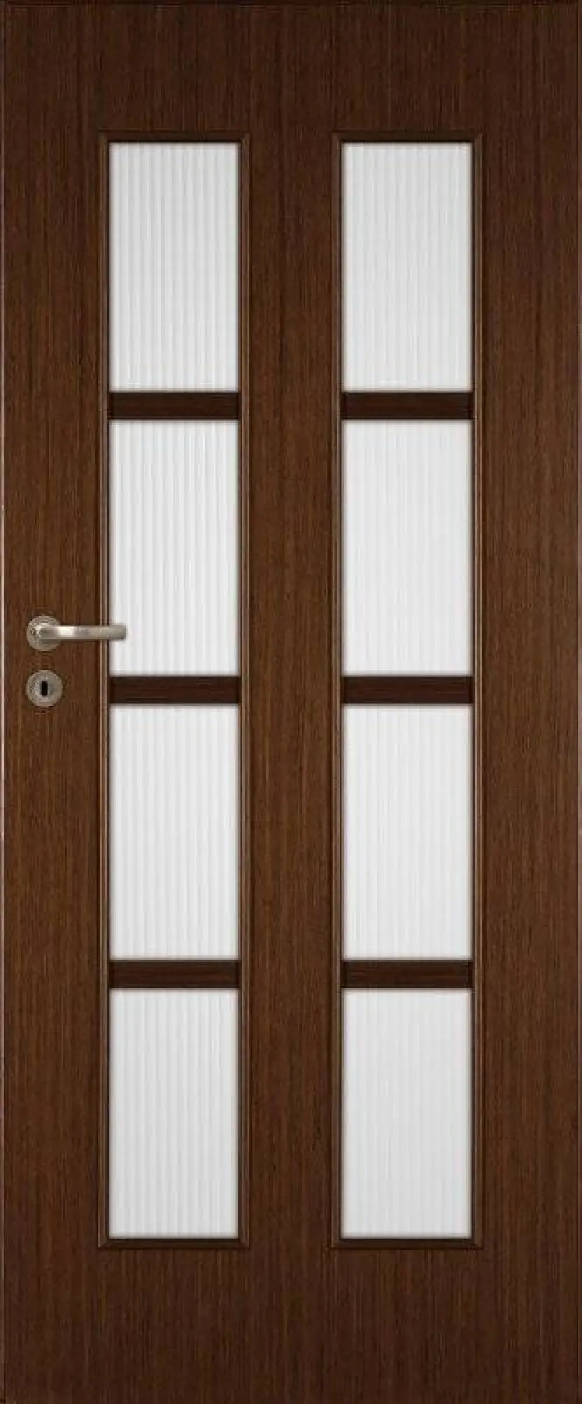 Rama skrzydła wykonana z drewna iglastego. Wypełnienie stanowi plaster miodu. Płyta zewnętrzna jest oklejona naturalnym fornirem i zabezpieczona lakierem UV. Specyfiką okleiny naturalnej jest możliwość wystąpienia różnic w usłojeniu i ubarwieniu. Krawędź prosta. Drzwi wyposażone w szybę o grubości 4 mm.