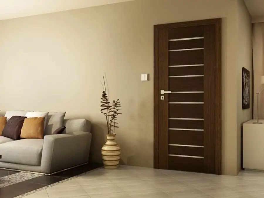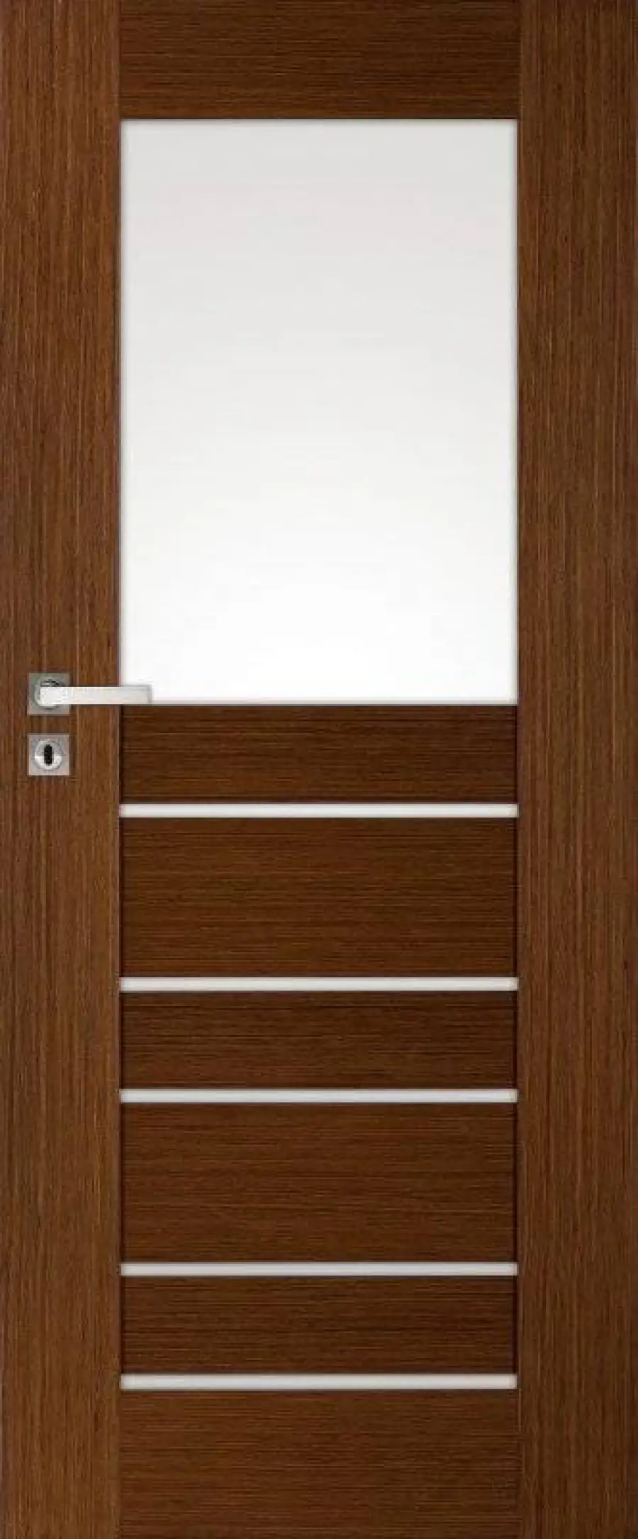 Rama skrzydła wykonana z płyty MDF. Wypełnienie stanowi płyta MDF. Drzwi pokryte okleiną naturalną. Uzupełnione szybą hartowaną o grubości 8 mm.