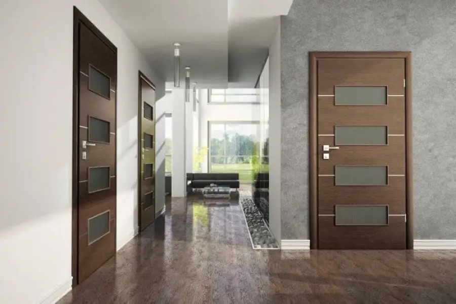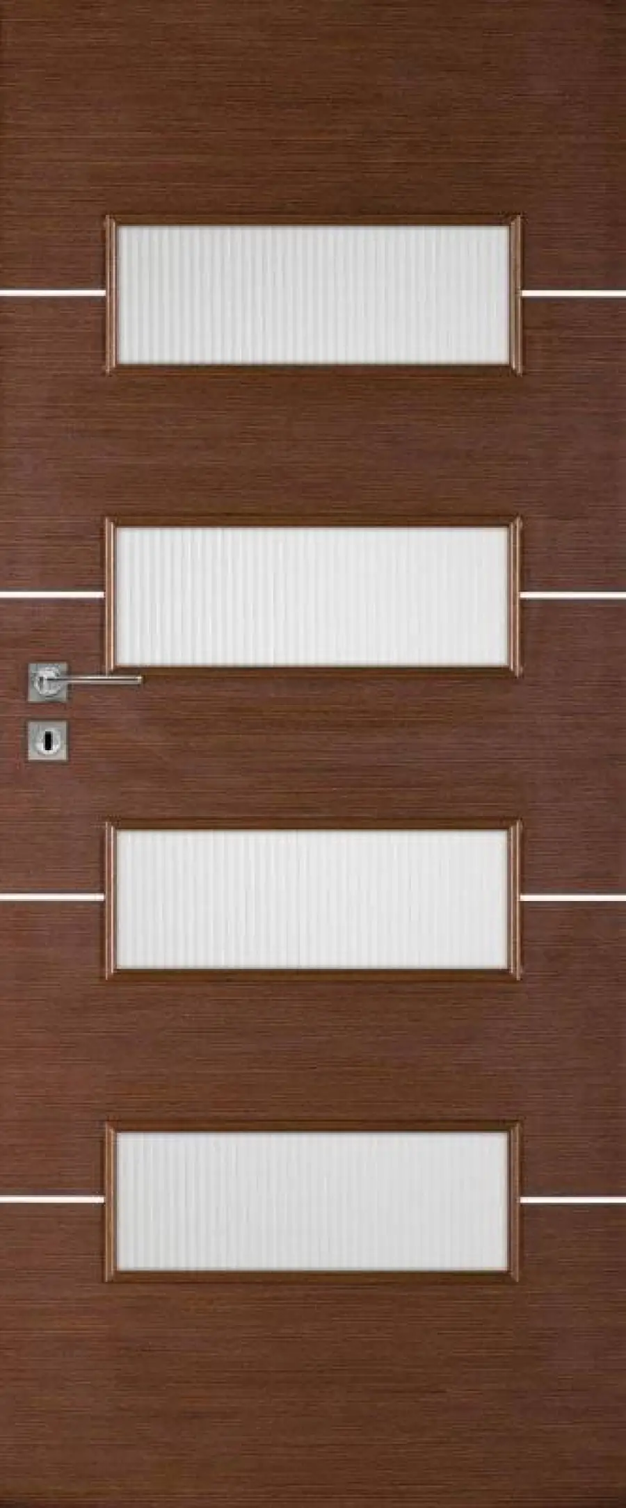 Rama skrzydła wykonana z drewna iglastego. Wypełnienie stanowi płyta wiórowa otworowa. Pokryta okleiną naturalną zabezpieczoną lakierem UV. Drzwi zawierają aluminiowe wstawki o przekroju 8x2 mm oraz szybę o grubości 4 mm. Specyfiką okleiny naturalnej jest możliwość wystąpienia różnic w usłojeniu i ubarwieniu.
