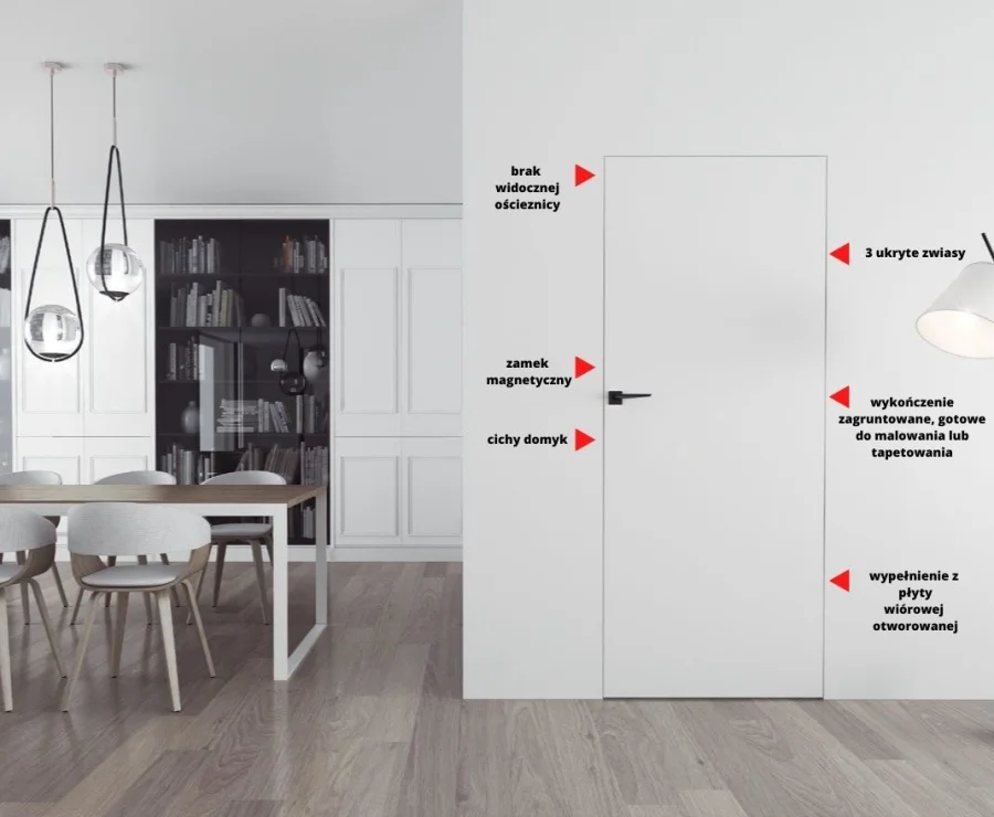 - Wypełenienie z płyty wiórowo otworowanej wycisza pomieszczenie, a trzy ukryte zawiasy zapewniają długotrwałą stabilność drzwi