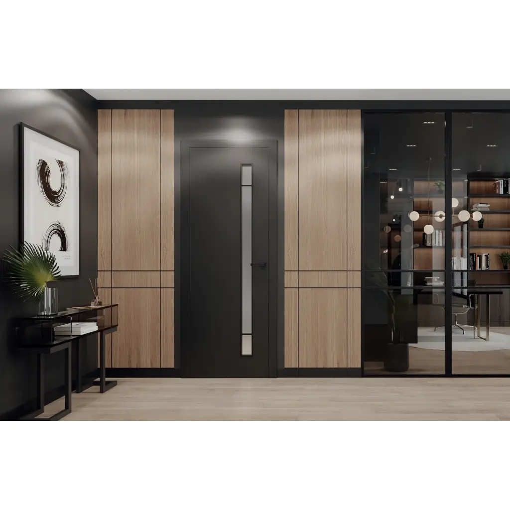 Soho to kolekcja drzwi wewnętrznych płytowych z bezpieczną mleczną lub transparentną szybą oraz czarnymi geometrycznymi podziałami. Do wyboru jest kilka modeli w różnych kolorach i wysokościach.