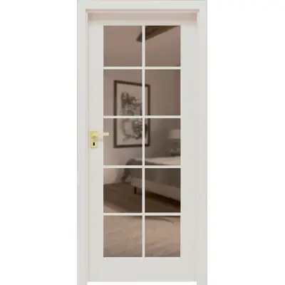 Kolekcja drzwi wewnętrznych Royal od Ego-Line to eleganckie połączenie klasyki i nowoczesności. Konstrukcja skrzydła oparta jest na solidnym ramiaku MDF oraz dekoracyjnych szprosach z MDF, które nadają drzwiom wyjątkowoego charakteru. W zależności od modelu, drzwi wyposażone są w hartowane szkło o grubości 4 mm, które wprowadza do wnętrz więcej światła i lekkości. Krawędzie boczne oraz górna zostały zabezpieczone trwałą okleiną, a zaokrąglone krawędzie pionowe podkreślają estetykę wykonania. W wersji podwójnej zastosowano felc i przeciwfelc dla lepszego domknięcia i spójności wizualnej. Skrzydło można podciąć maksymalnie o 30 mm, co pozwala na dostosowanie drzwi do indywidualnych wymagań wnętrza.