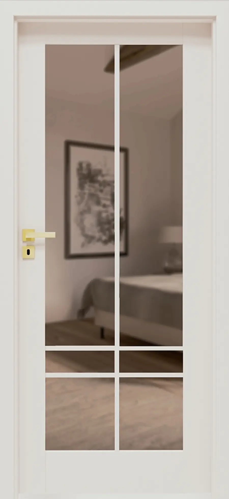 Kolekcja drzwi wewnętrznych Royal od Ego-Line to eleganckie połączenie klasyki i nowoczesności. Konstrukcja skrzydła oparta jest na solidnym ramiaku MDF oraz dekoracyjnych szprosach z MDF, które nadają drzwiom wyjątkowoego charakteru. W zależności od modelu, drzwi wyposażone są w hartowane szkło o grubości 4 mm, które wprowadza do wnętrz więcej światła i lekkości. Krawędzie boczne oraz górna zostały zabezpieczone trwałą okleiną, a zaokrąglone krawędzie pionowe podkreślają estetykę wykonania. W wersji podwójnej zastosowano felc i przeciwfelc dla lepszego domknięcia i spójności wizualnej. Skrzydło można podciąć maksymalnie o 30 mm, co pozwala na dostosowanie drzwi do indywidualnych wymagań wnętrza.