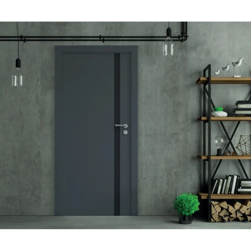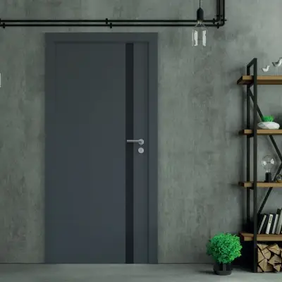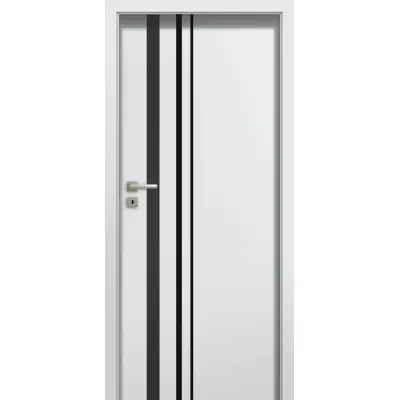 Drzwi zbudowane są z ramiaka drewnianego obłożonego dwiema gładkimi płytami HDF o powierzchni UNI MAT PLUS. Standardowe wypełnienie stanowi płyta wiórowa pełna. Dostępne w systemie przylgowym oraz bezprzylgowym.