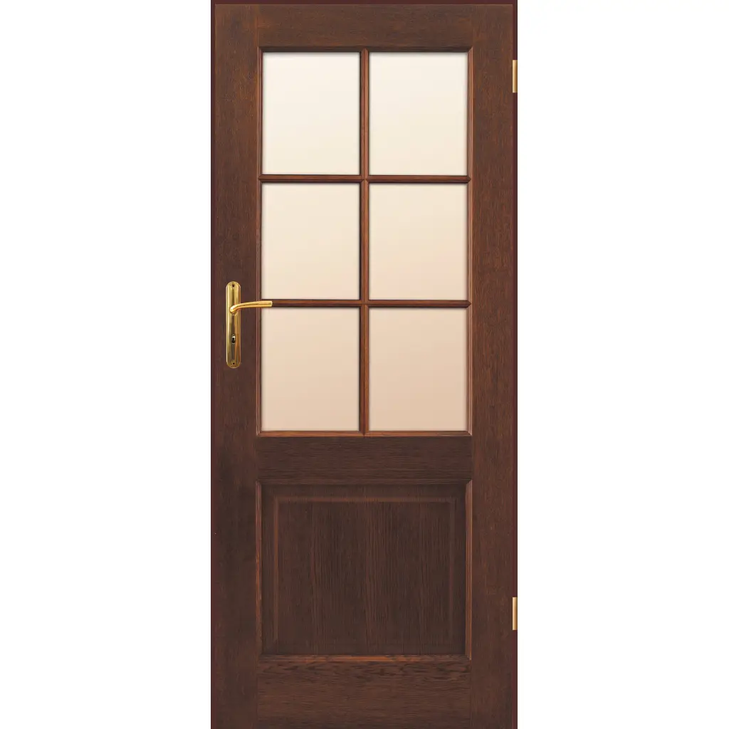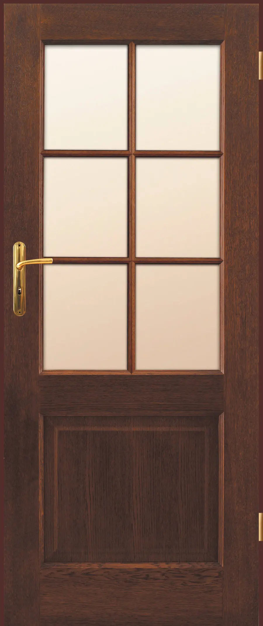 Drzwi INTERSOLID II zbudowane są z ramiaka drewnianego obłożonego dwiema płytami HDF pokrytymi naturalnymi okleinami. Płycina frezowana, ramiaki oraz płyciny fornirowane.
