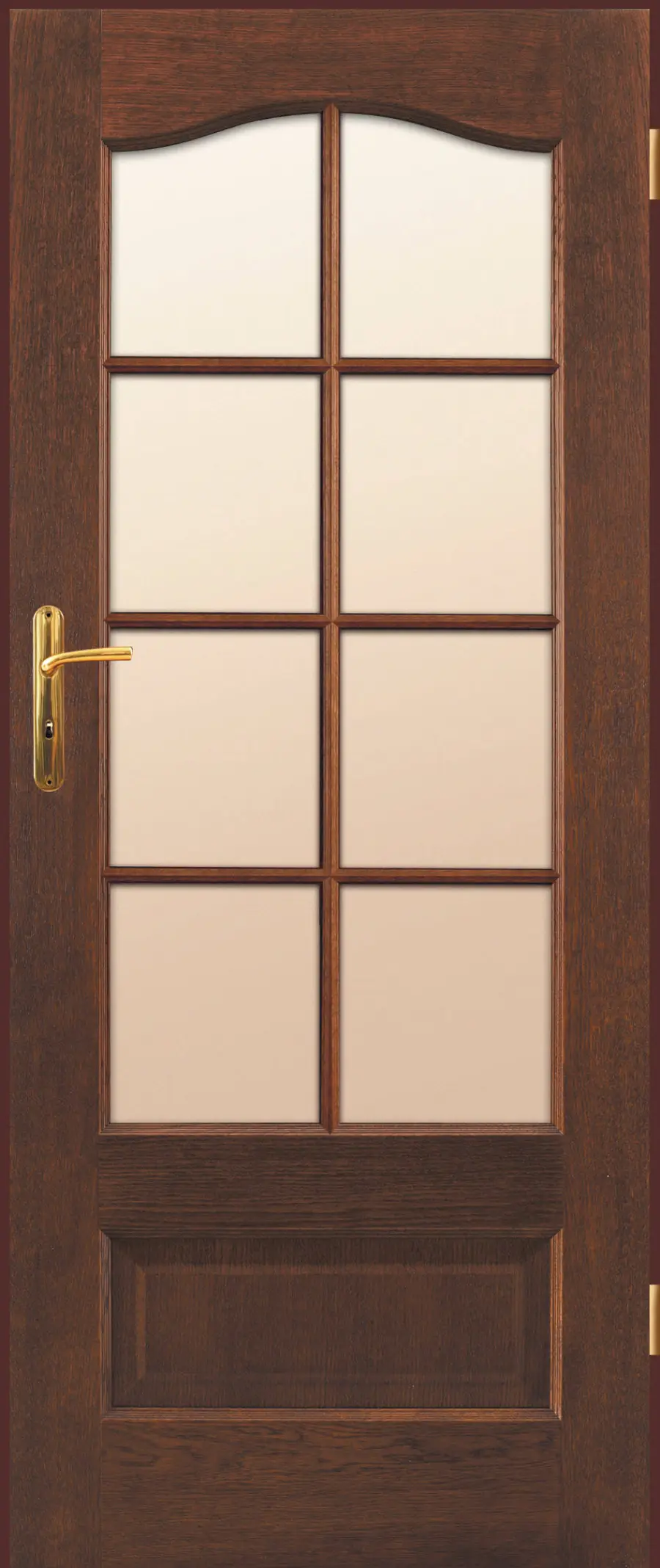 Drzwi INTERSOLID II zbudowane są z ramiaka drewnianego obłożonego dwiema płytami HDF pokrytymi naturalnymi okleinami. Płycina frezowana, ramiaki oraz płyciny fornirowane.