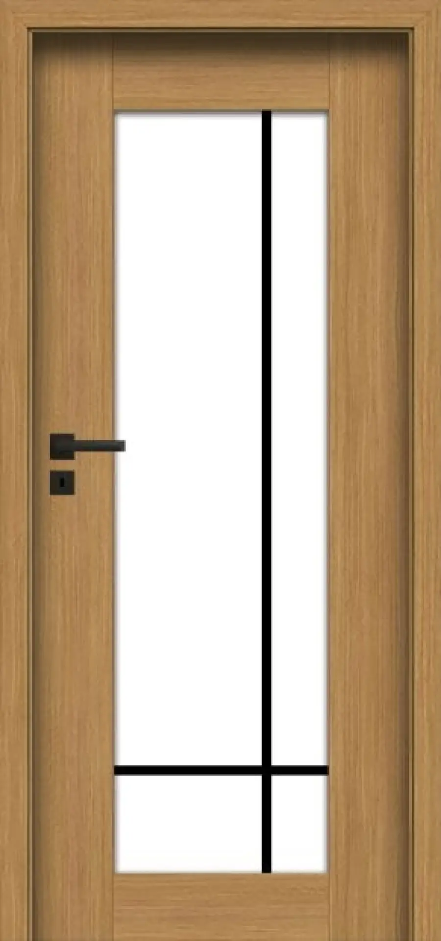 Drzwi pokryte są laminatem CPL 0,15 mm z kolekcji LAMISTONE lub SILKSTONE, co zapewnia trwałość i estetyczny wygląd. Wzory z przeszkleniami wyposażone są w hartowane szkło o grubości 4 mm, dostępne w wersji biały mat lub przeziernej. Dekoracyjne szprosy mogą być w kolorze skrzydła lub czarne, co dodaje elegancji i pozwala na dopasowanie drzwi do indywidualnych preferencji.