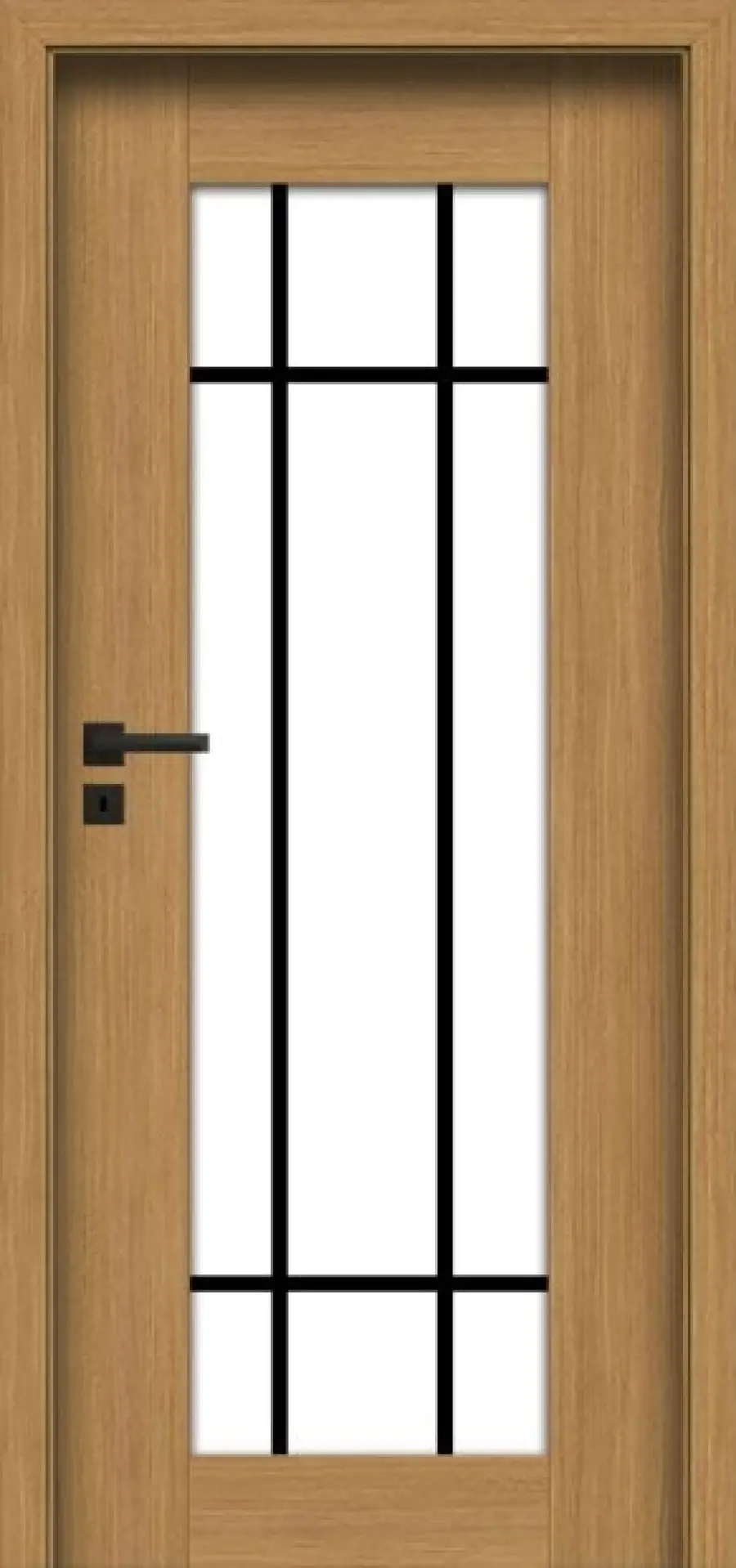 Drzwi pokryte są laminatem CPL 0,15 mm z kolekcji LAMISTONE lub SILKSTONE, co zapewnia trwałość i estetyczny wygląd. Wzory z przeszkleniami wyposażone są w hartowane szkło o grubości 4 mm, dostępne w wersji biały mat lub przeziernej. Dekoracyjne szprosy mogą być w kolorze skrzydła lub czarne, co dodaje elegancji i pozwala na dopasowanie drzwi do indywidualnych preferencji.