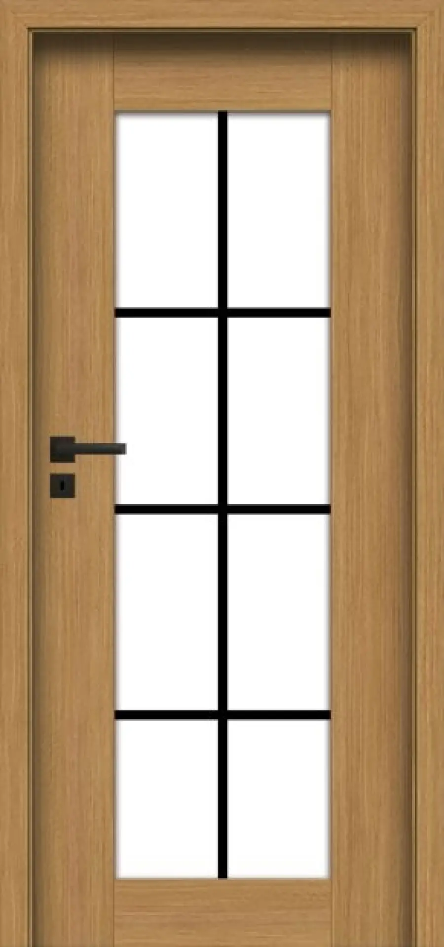 Drzwi pokryte są laminatem CPL 0,15 mm z kolekcji LAMISTONE lub SILKSTONE, co zapewnia trwałość i estetyczny wygląd. Wzory z przeszkleniami wyposażone są w hartowane szkło o grubości 4 mm, dostępne w wersji biały mat lub przeziernej. Dekoracyjne szprosy mogą być w kolorze skrzydła lub czarne, co dodaje elegancji i pozwala na dopasowanie drzwi do indywidualnych preferencji.