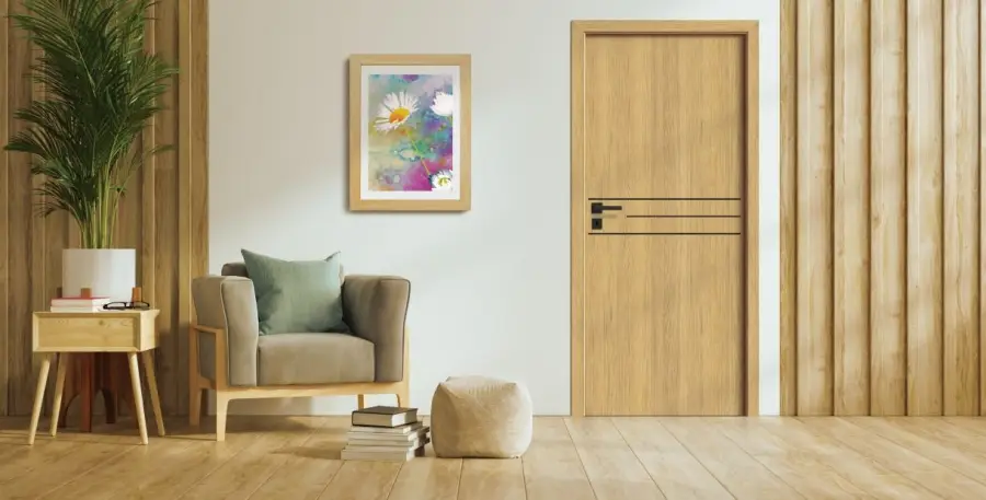 Drzwi zbudowane są z ramiaka drewnianego obłożonego dwiema gładkimi płytami HDF o powierzchni fornirów naturalnych.