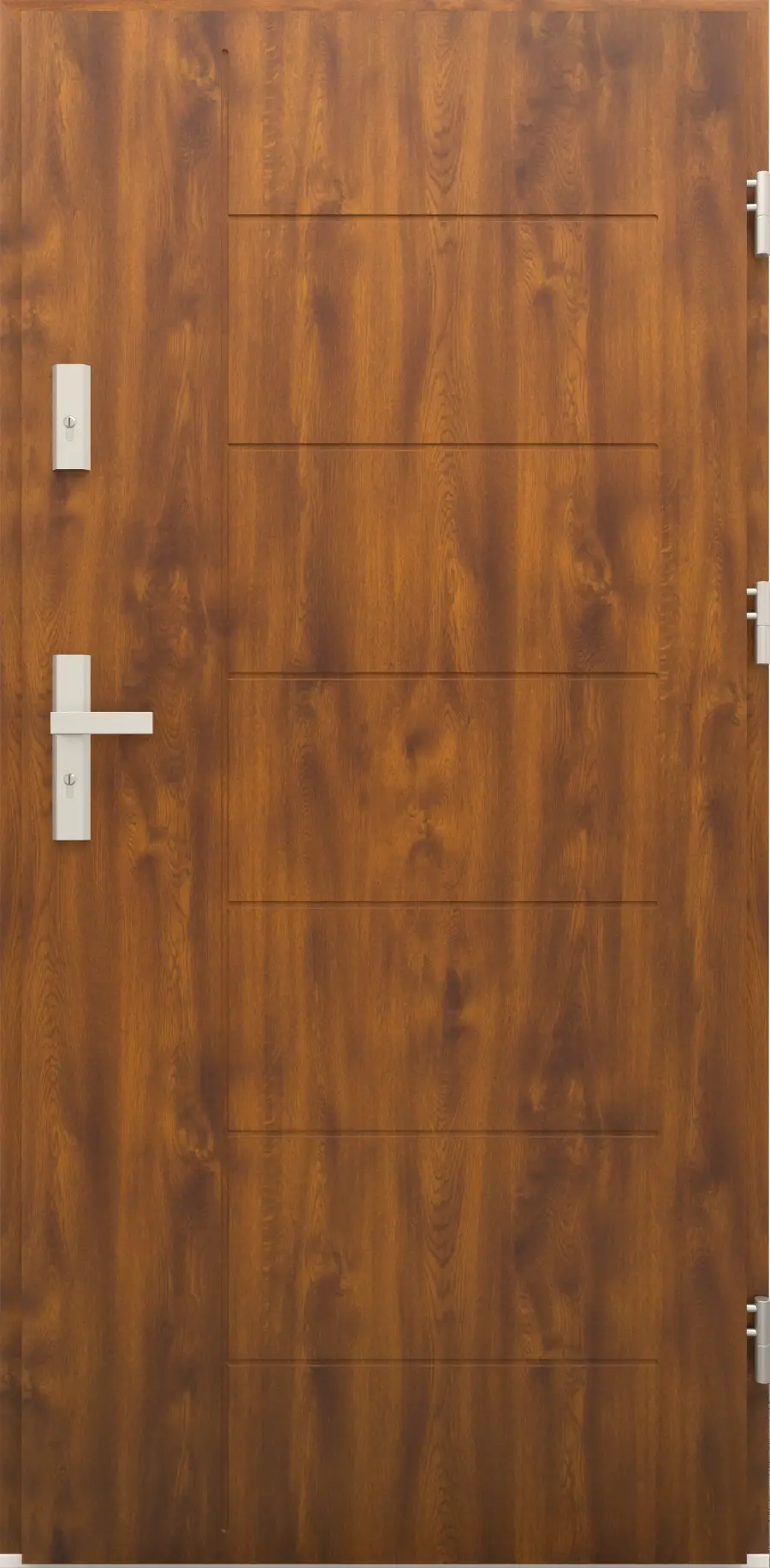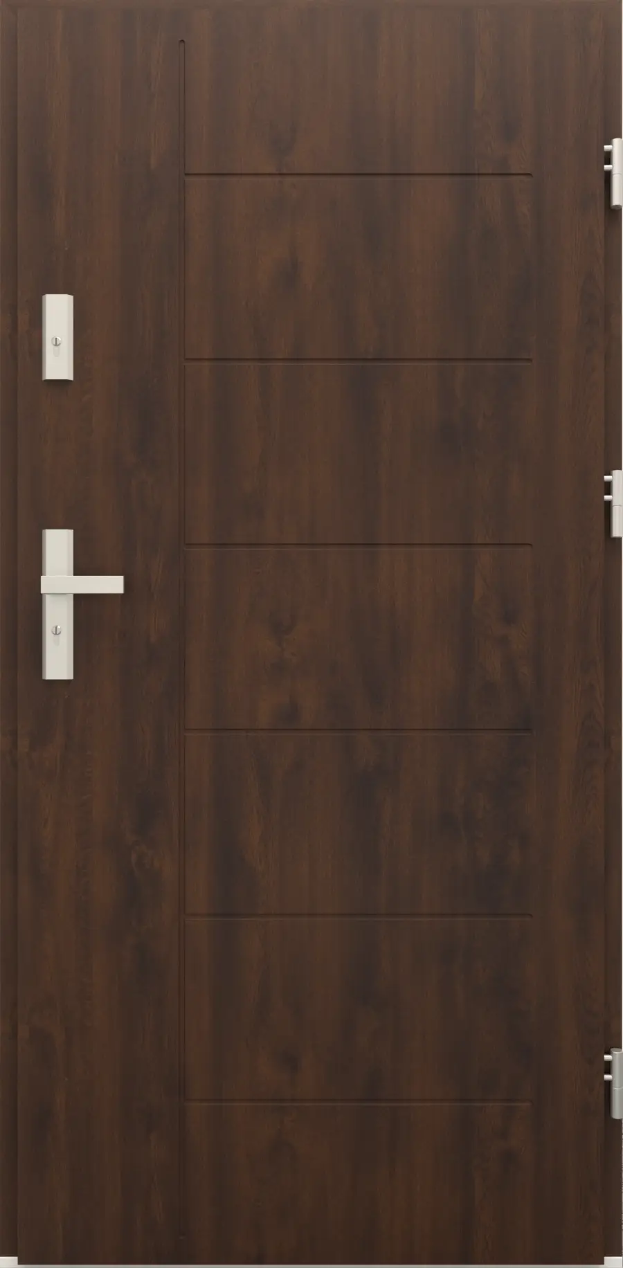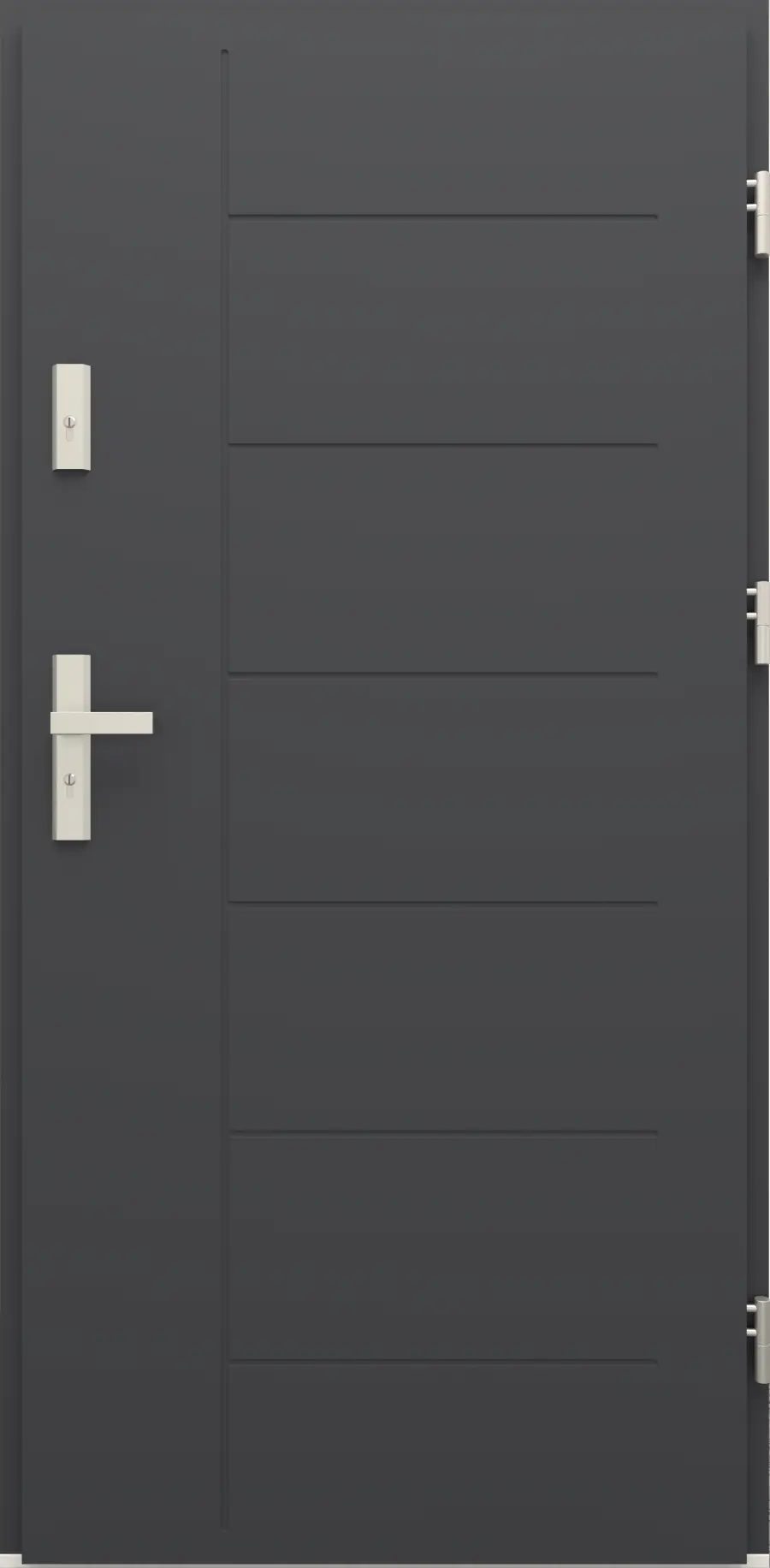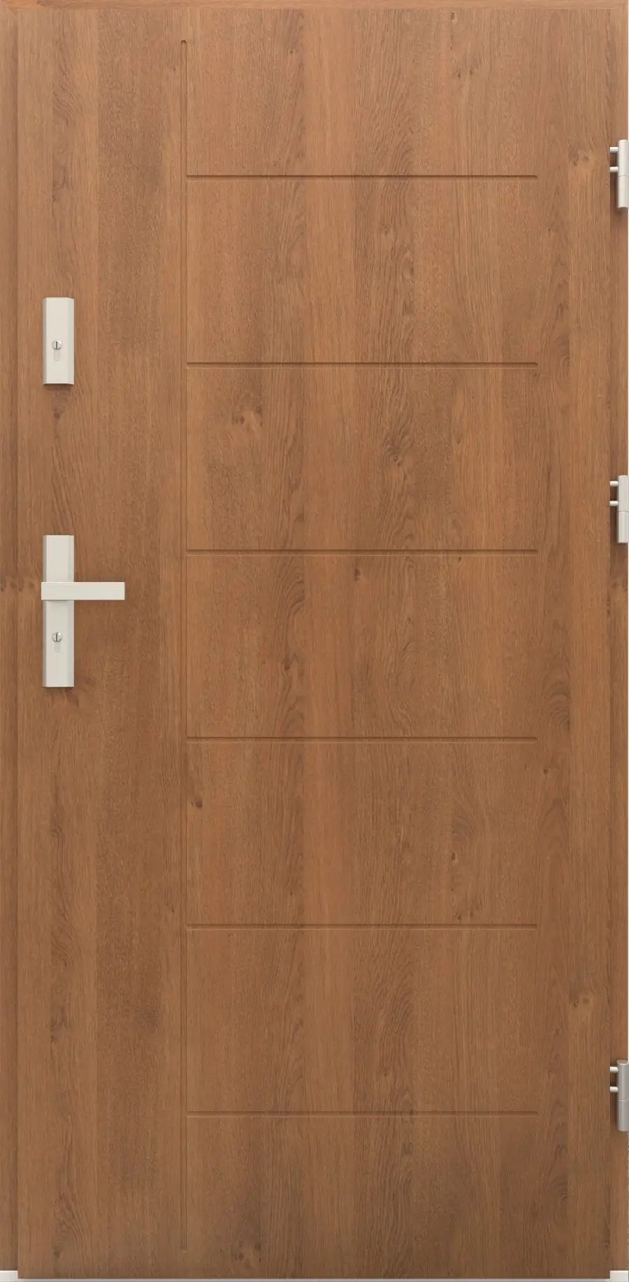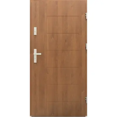 - Bezpieczeństwo i szczelność: Drzwi posiadają zamek trójbolcowy, uszczelki w skrzydle, ościeżnicy i progu oraz trzy zawiasy. Dzięki temu są stabilne, szczelne i bezpieczne.