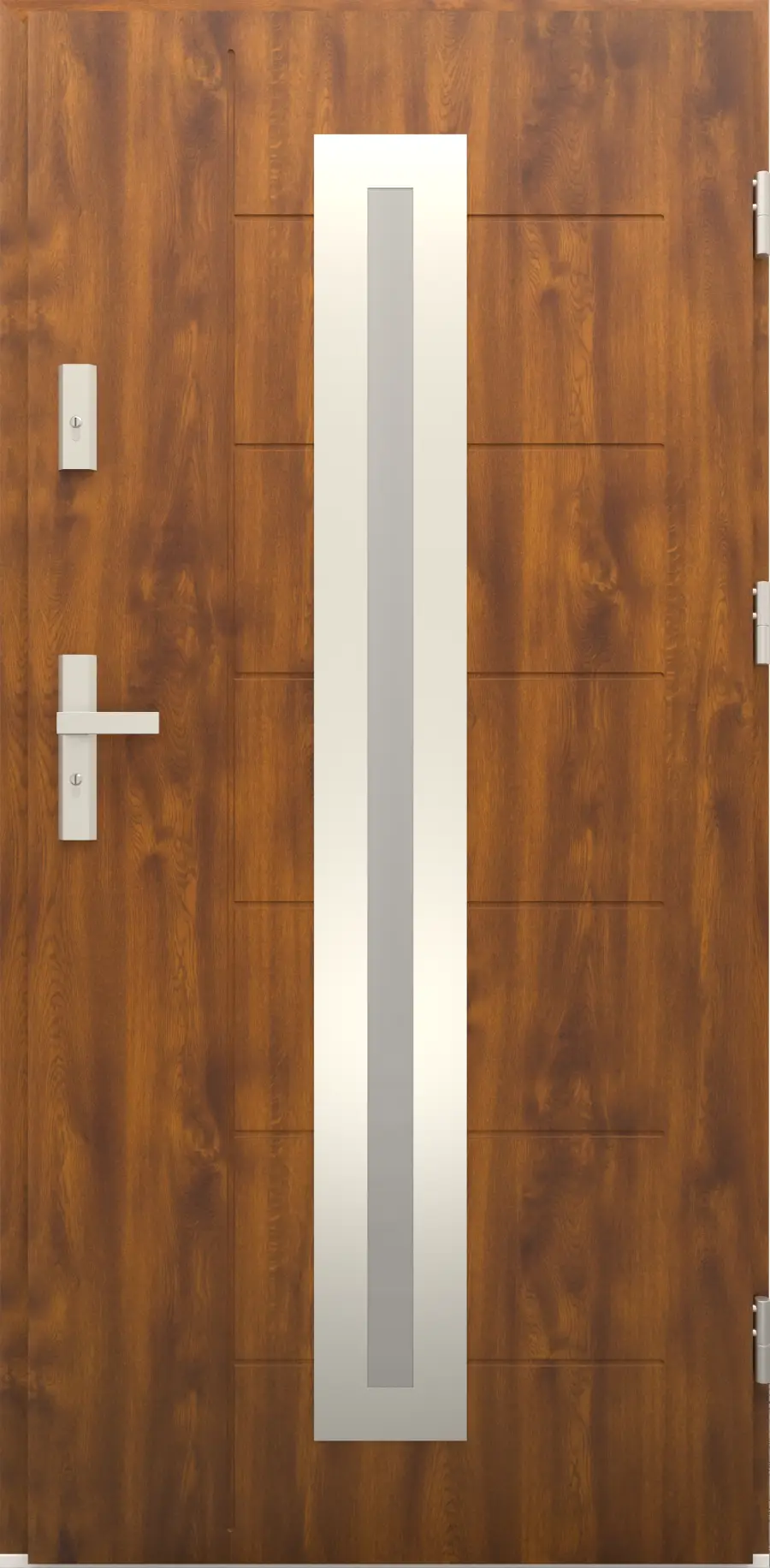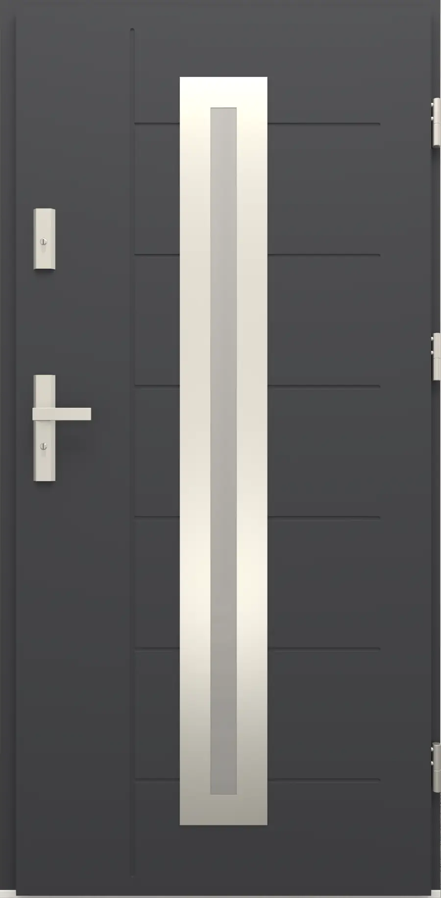 - Bezpieczeństwo i szczelność: Drzwi posiadają zamek trójbolcowy, uszczelki w skrzydle, ościeżnicy i progu oraz trzy zawiasy. Dzięki temu są stabilne, szczelne i bezpieczne.