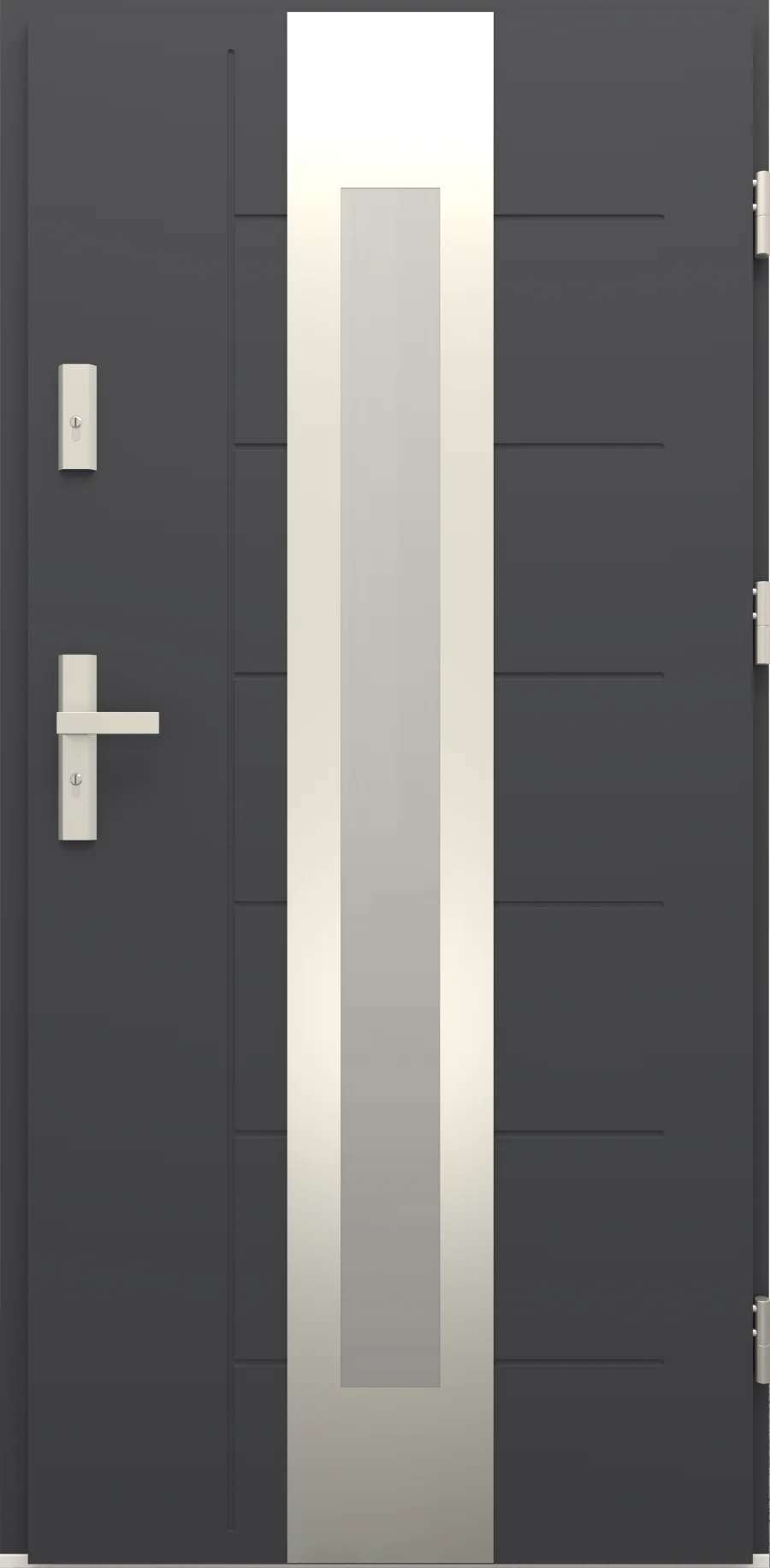 - Próg w standardzie: W standardzie drzwi wyposażone są w próg w kolorze inox, co dodaje industrialnego akcentu i funkcjonalności.