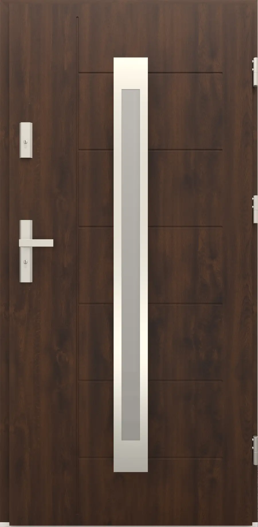 - Bezpieczeństwo i szczelność: Drzwi posiadają zamek trójbolcowy, uszczelki w skrzydle, ościeżnicy i progu oraz trzy zawiasy. Dzięki temu są stabilne, szczelne i bezpieczne.