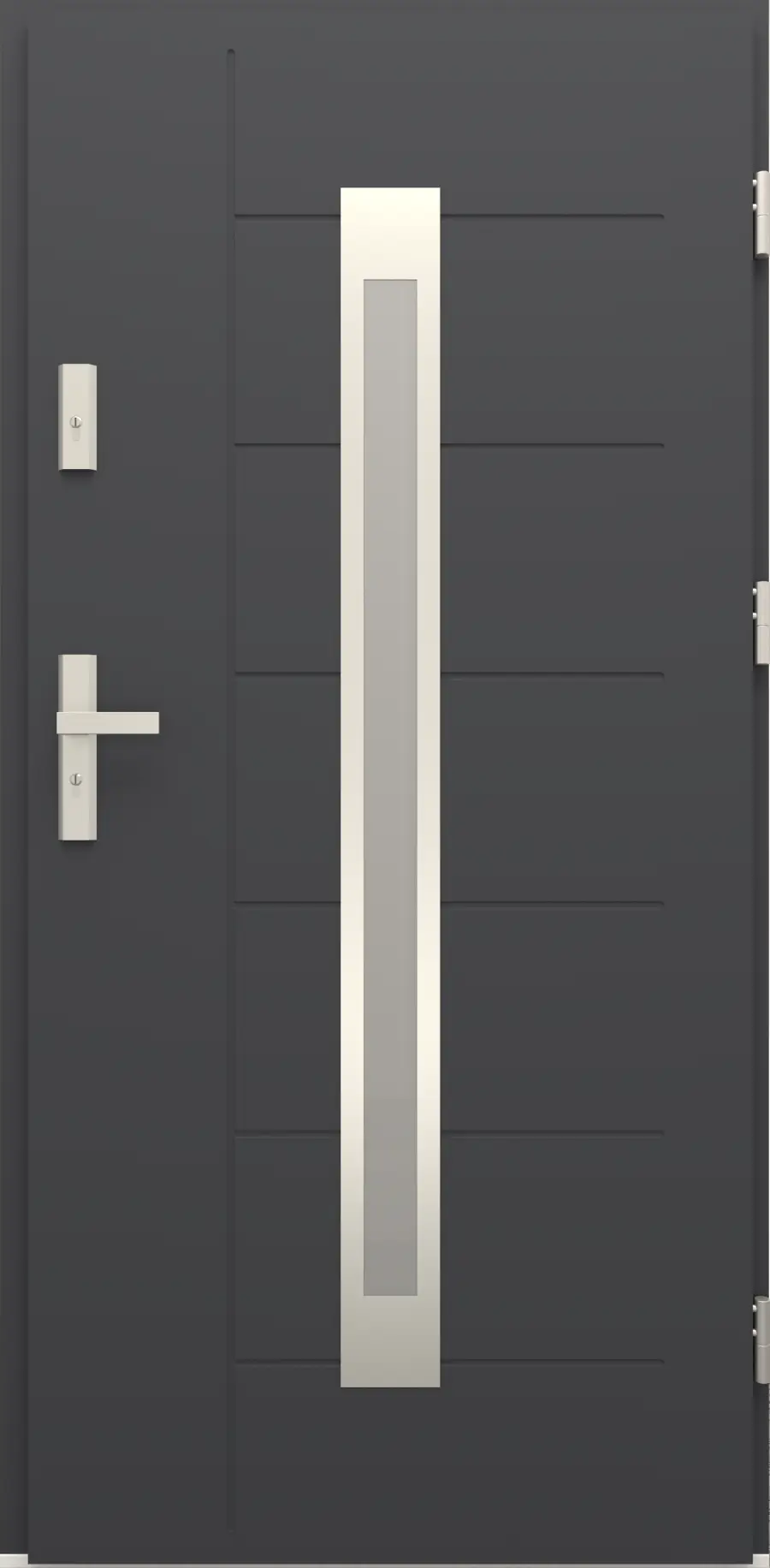 - Próg w standardzie: W standardzie drzwi wyposażone są w próg w kolorze inox, co dodaje industrialnego akcentu i funkcjonalności.