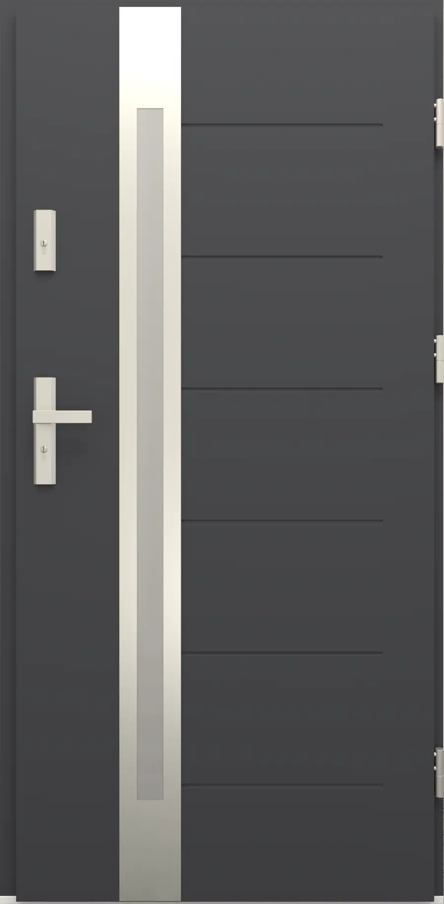 - Próg w standardzie: W standardzie drzwi wyposażone są w próg w kolorze inox, co dodaje industrialnego akcentu i funkcjonalności.