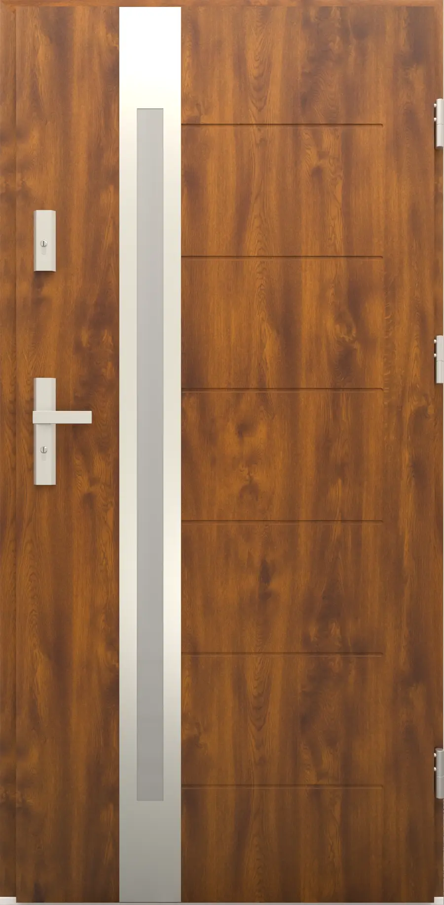 - Bezpieczeństwo i szczelność: Drzwi posiadają zamek trójbolcowy, uszczelki w skrzydle, ościeżnicy i progu oraz trzy zawiasy. Dzięki temu są stabilne, szczelne i bezpieczne.