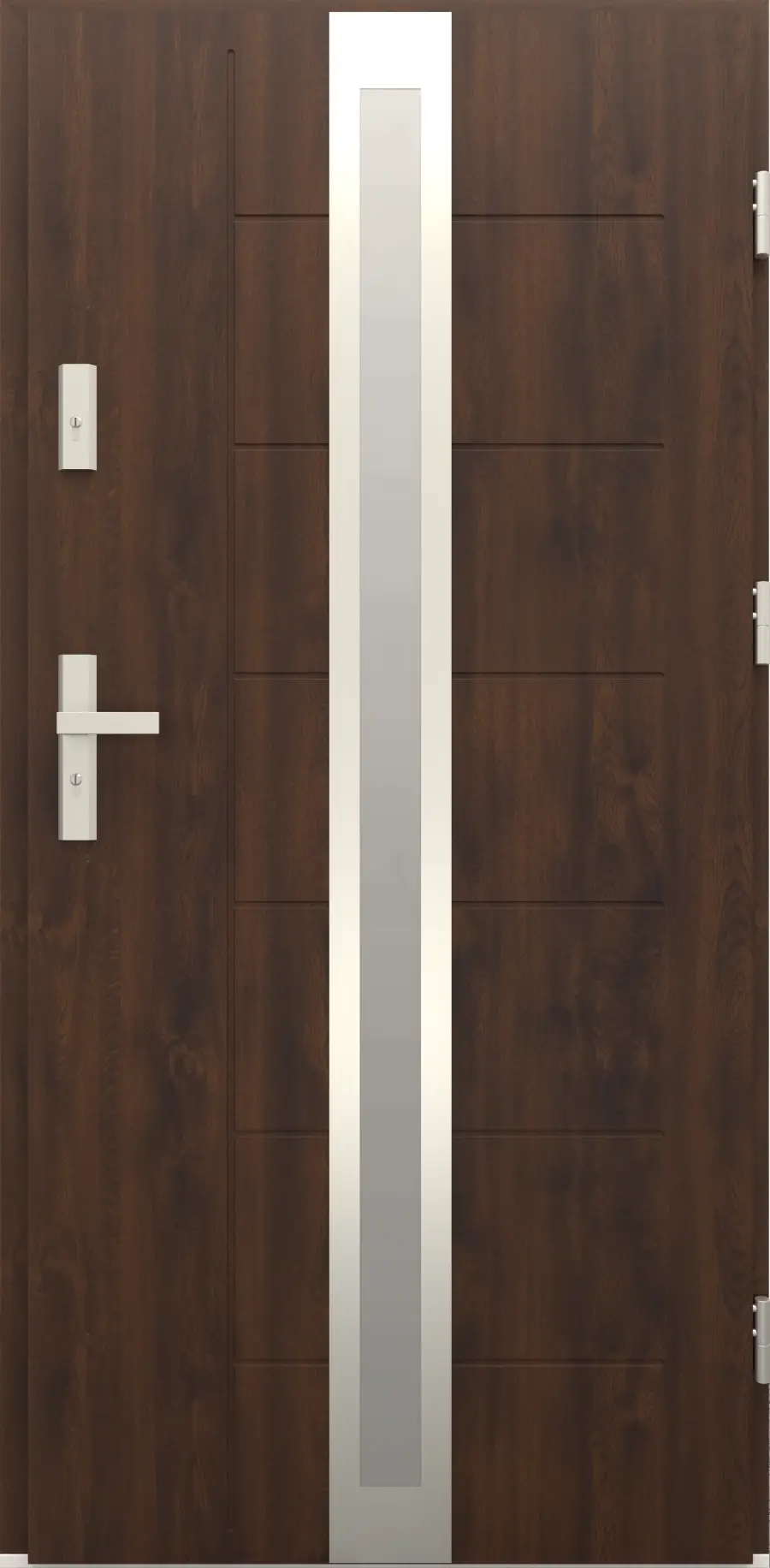 - Bezpieczeństwo i szczelność: Drzwi posiadają zamek trójbolcowy, uszczelki w skrzydle, ościeżnicy i progu oraz trzy zawiasy. Dzięki temu są stabilne, szczelne i bezpieczne.