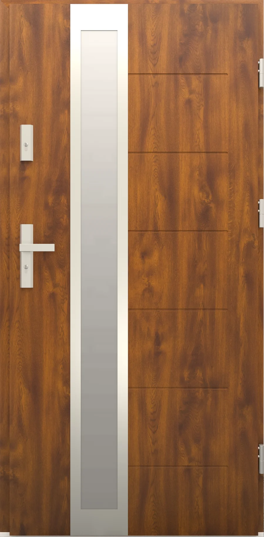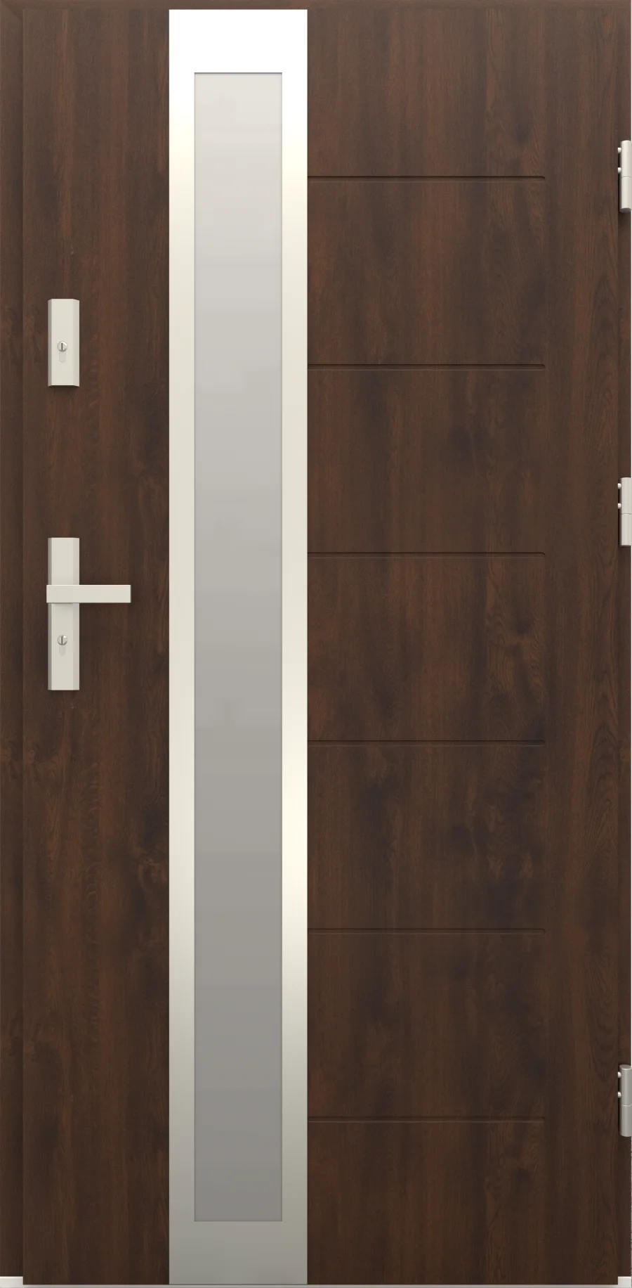 - Bezpieczeństwo i szczelność: Drzwi posiadają zamek trójbolcowy, uszczelki w skrzydle, ościeżnicy i progu oraz trzy zawiasy. Dzięki temu są stabilne, szczelne i bezpieczne.