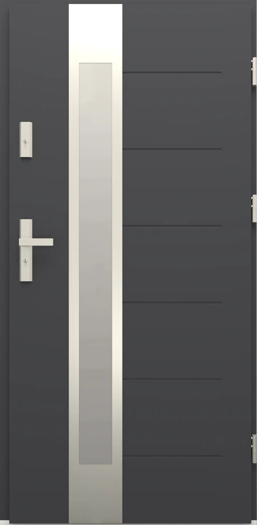 - Próg w standardzie: W standardzie drzwi wyposażone są w próg w kolorze inox, co dodaje industrialnego akcentu i funkcjonalności.