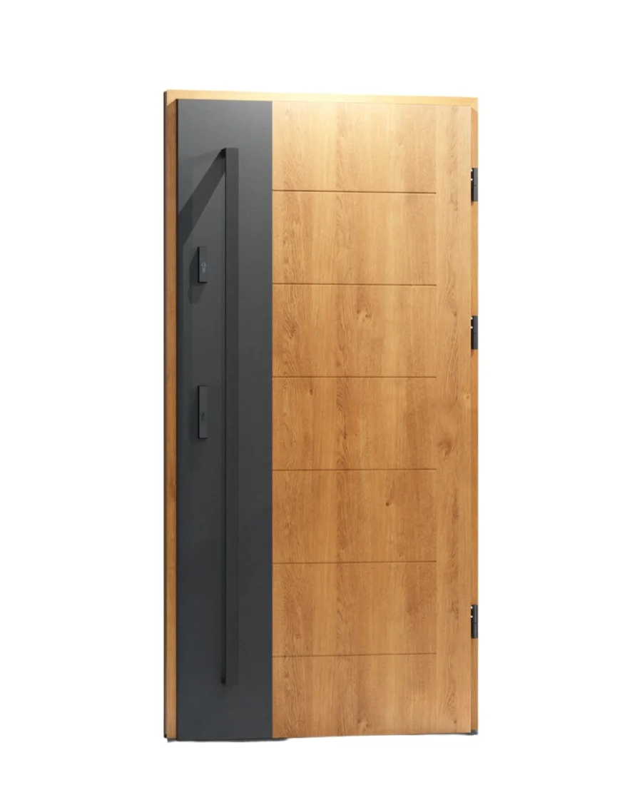 Kolekcja Vento to linia drzwi zewnętrznych, które łączą minimalistyczny design z dopracowanym detalem. Gładkie, nowocześnie tłoczone skrzydła można wybrać w wersjach z przeszkleniem lub bez, a charakter kolekcji budują dekoracyjne panele z aluminium malowanego proszkowo na czarno - o delikatnej fakturze typu "skórka pomarańczy". Efekt? Elegancki, współczesny wygląd, który wyróżnia wejście już od pierwszego spojrzenia.