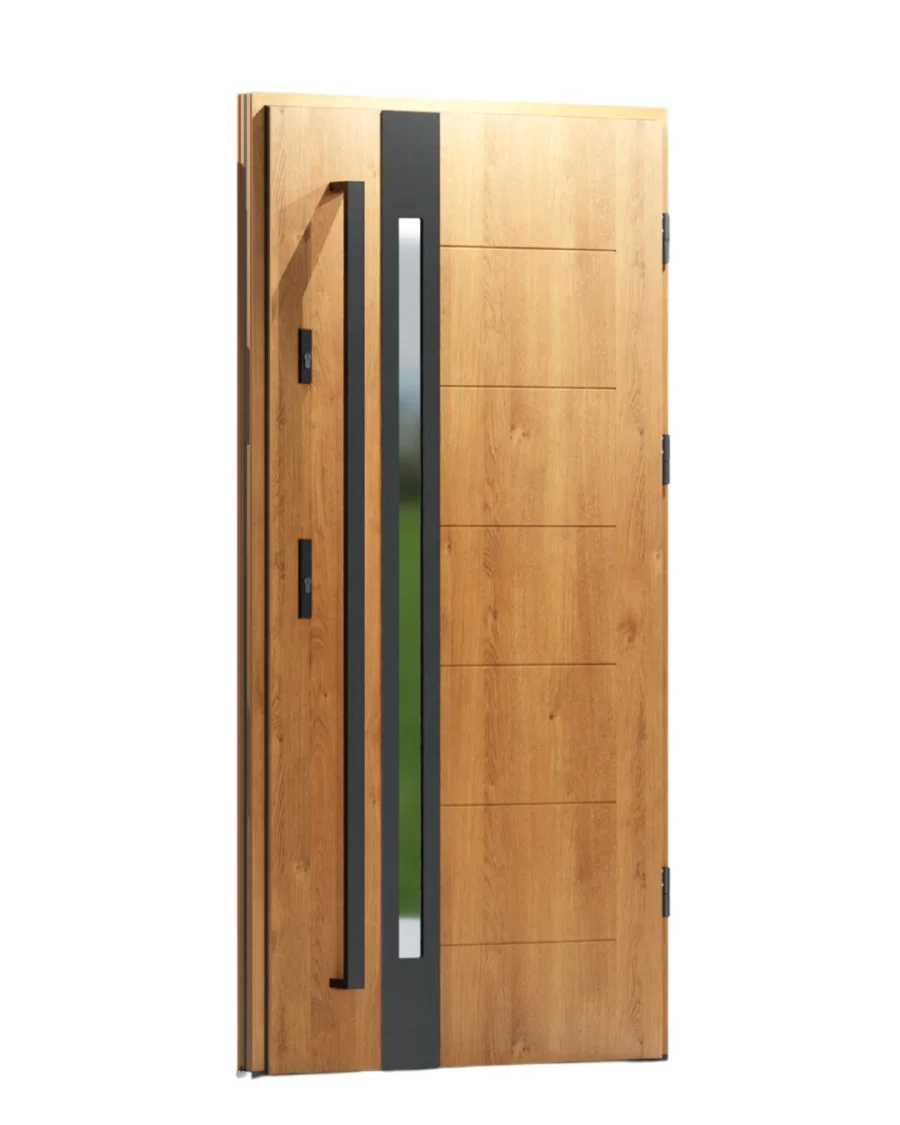 Kolekcja Vento to linia drzwi zewnętrznych, które łączą minimalistyczny design z dopracowanym detalem. Gładkie, nowocześnie tłoczone skrzydła można wybrać w wersjach z przeszkleniem lub bez, a charakter kolekcji budują dekoracyjne panele z aluminium malowanego proszkowo na czarno - o delikatnej fakturze typu "skórka pomarańczy". Efekt? Elegancki, współczesny wygląd, który wyróżnia wejście już od pierwszego spojrzenia.