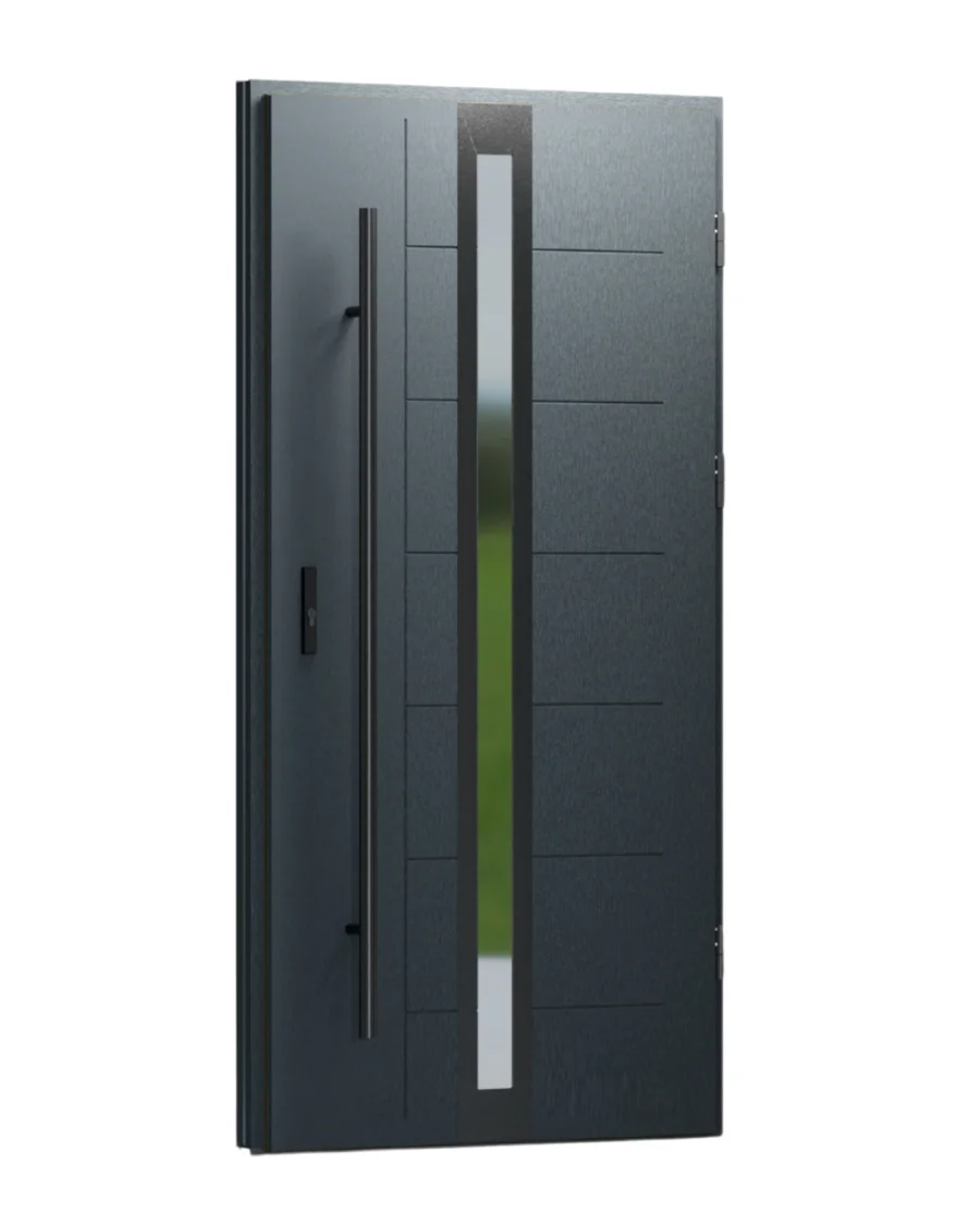 Kolekcja Vento to linia drzwi zewnętrznych, które łączą minimalistyczny design z dopracowanym detalem. Gładkie, nowocześnie tłoczone skrzydła można wybrać w wersjach z przeszkleniem lub bez, a charakter kolekcji budują dekoracyjne panele z aluminium malowanego proszkowo na czarno - o delikatnej fakturze typu "skórka pomarańczy". Efekt? Elegancki, współczesny wygląd, który wyróżnia wejście już od pierwszego spojrzenia.