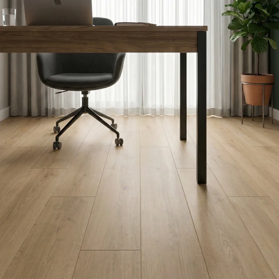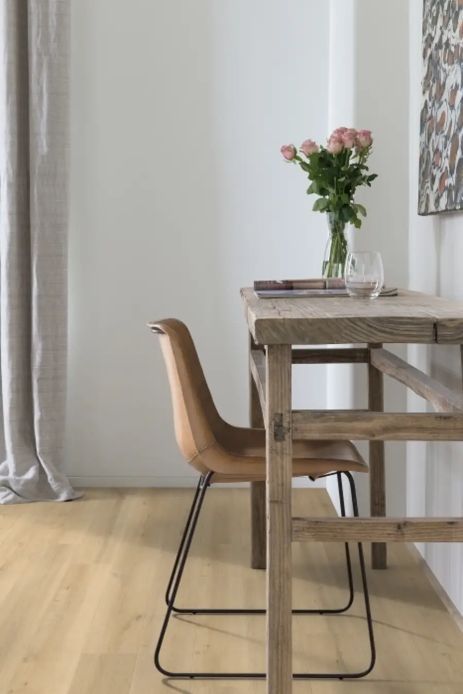 Powierzchnia w 100% szczelna i plamoodporna – brud i płyny nie wnikają w strukturę, co ułatwia codzienne utrzymanie podłogi w czystości.