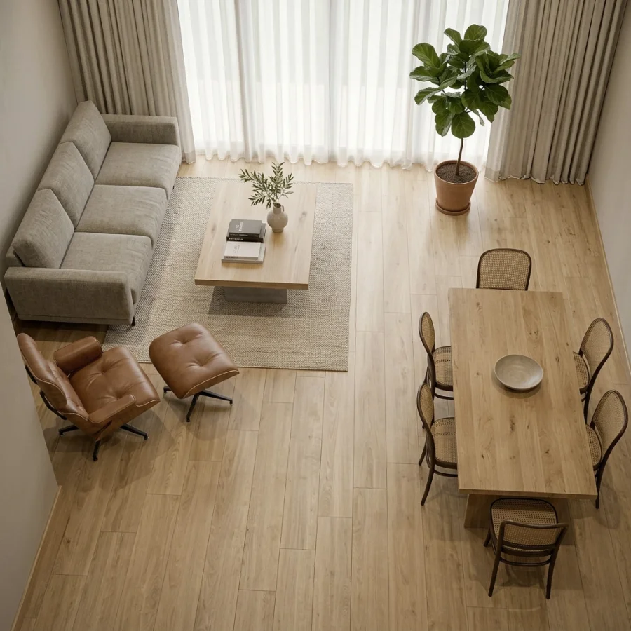 Powierzchnia w 100% szczelna i plamoodporna – brud i płyny nie wnikają w strukturę, co ułatwia codzienne utrzymanie podłogi w czystości.