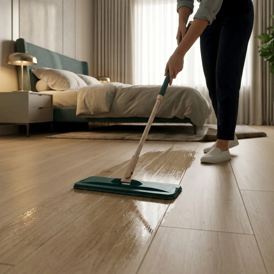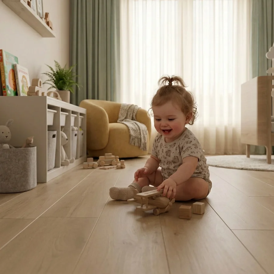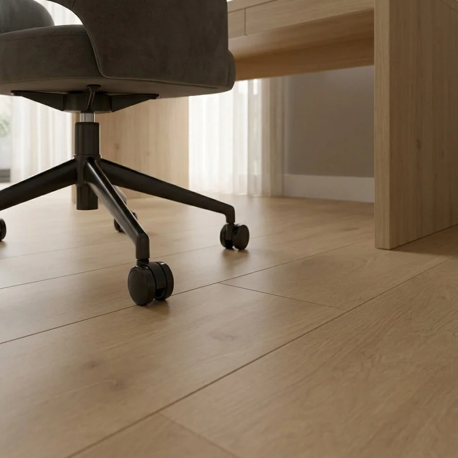 Powierzchnia w 100% szczelna i plamoodporna – brud i płyny nie wnikają w strukturę, co ułatwia codzienne utrzymanie podłogi w czystości.