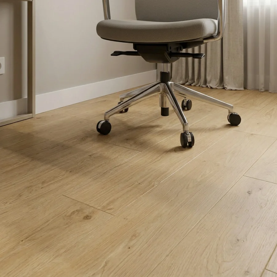 Powierzchnia w 100% szczelna i plamoodporna – brud i płyny nie wnikają w strukturę, co ułatwia codzienne utrzymanie podłogi w czystości.
