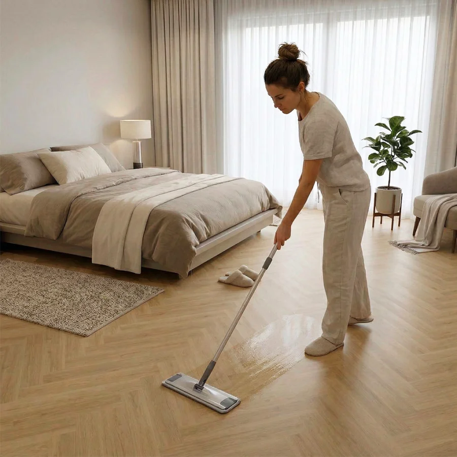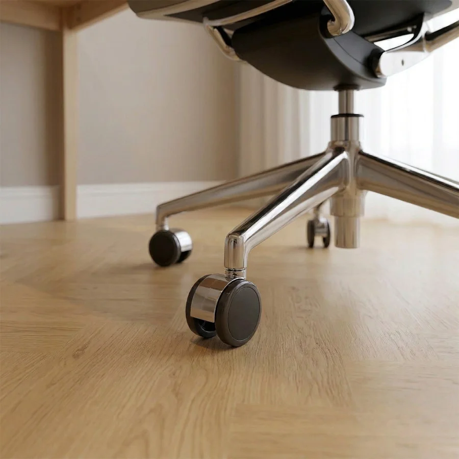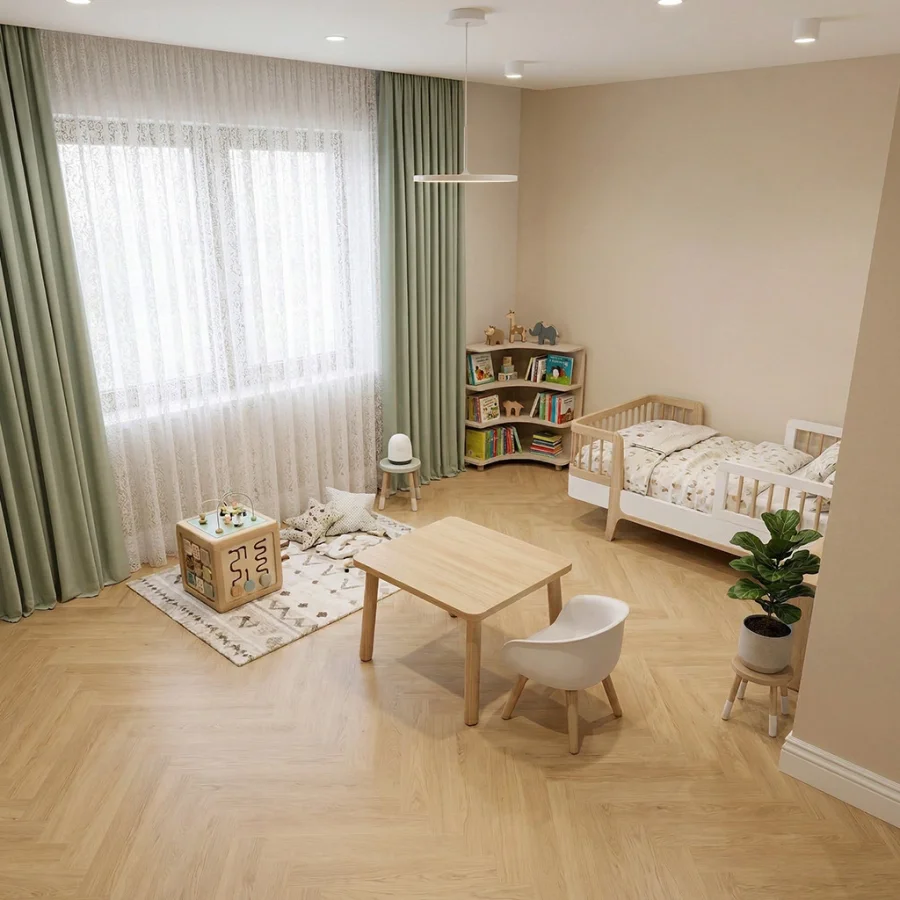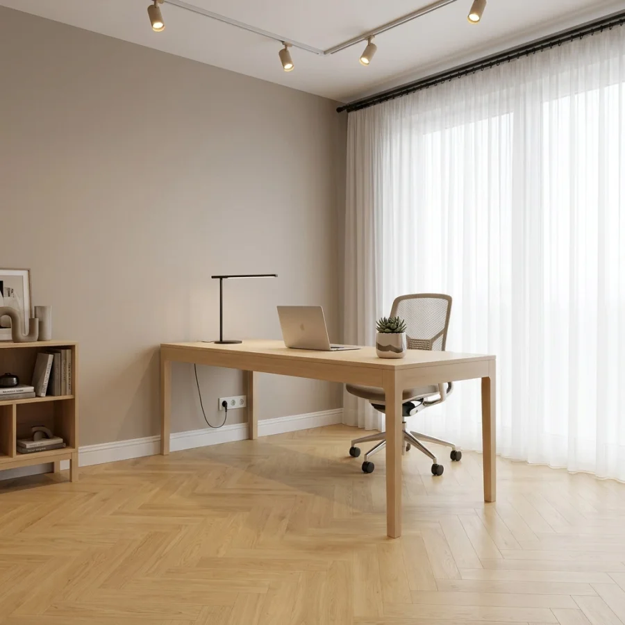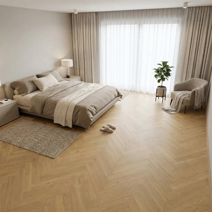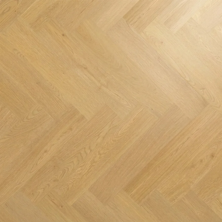 Matowe lub szczotkowane wykończenie nadaje podłodze wyjątkowej głębi i podkreśla naturalną strukturę drewna. Dzięki zastosowaniu czterostronnej zagniatanej V-fugi, panele perfekcyjnie imitują osobne deski, tworząc realistyczny efekt drewnianej podłogi w eleganckim układzie jodełki.