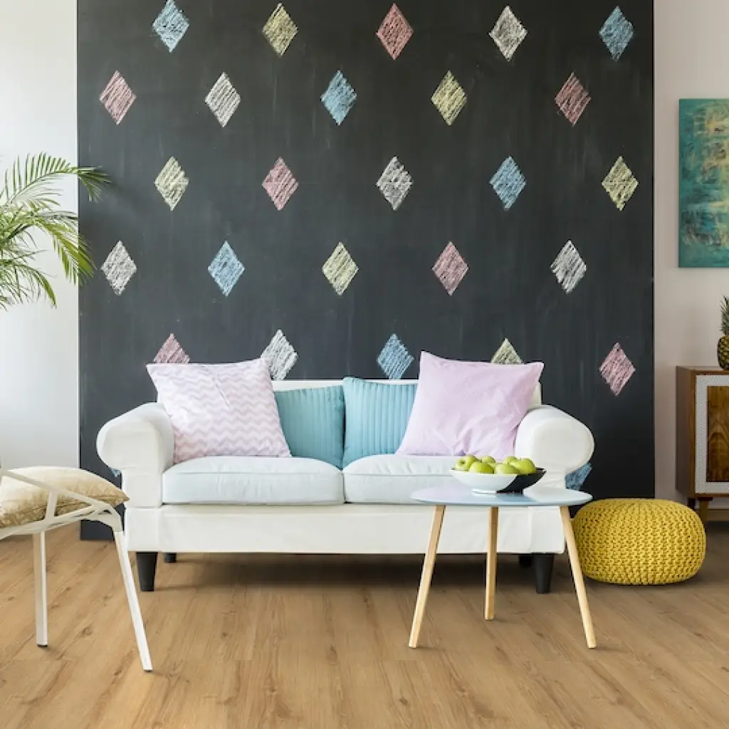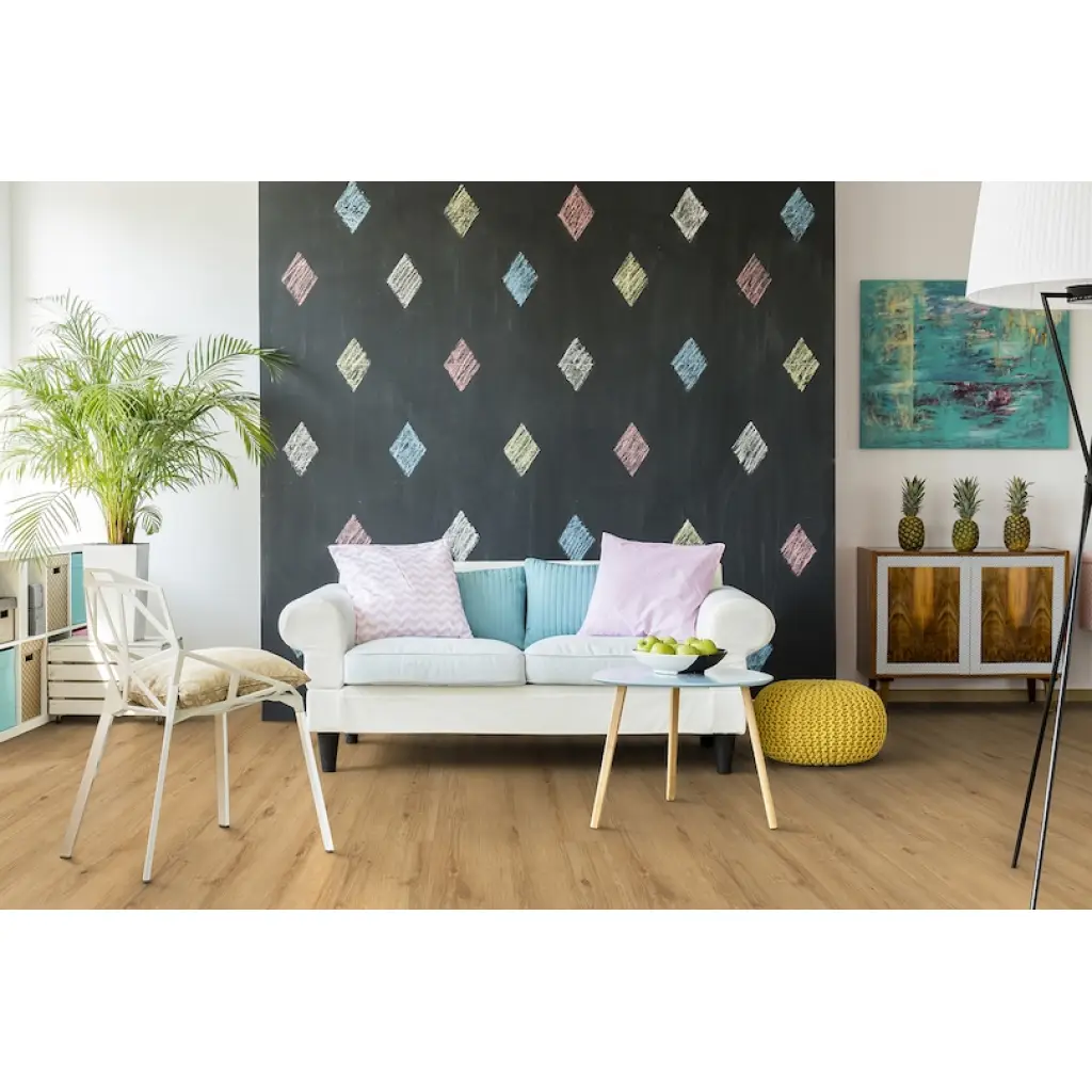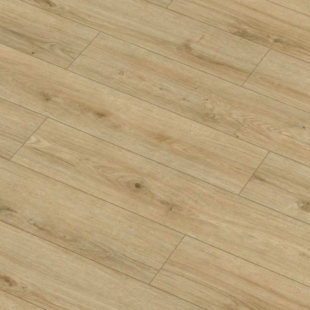 HydroClick to panele wodoodporne - aż do 100 godzin kontaktu z cieczą. Dzięki temu idealnie sprawdzają się w pomieszczeniach narażonych na bezpośredni kontakt z nią, jak wiatrołap czy kuchnia. Innowacyjnie frezowana V-fuga oraz dodatkowe zabezpieczenie krawędzi paneli w postaci warstwy wosku powstrzymują przenikanie cieczy pod podłogi, równocześnie wizualnie odcinając poszczególne deski od siebie, dzięki czemu przypominają one klasyczny, drewniany parkiet. Efekt wzmaga synchroniczna struktura paneli, przekładająca się na idealne odwzorowanie usłojenia prawdziwego, dębowego drewna.