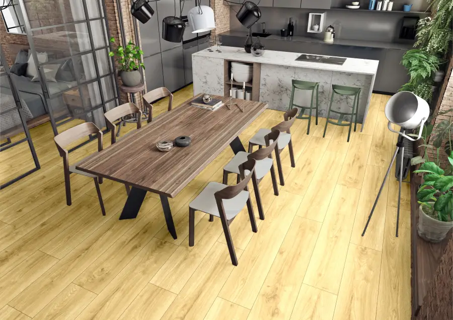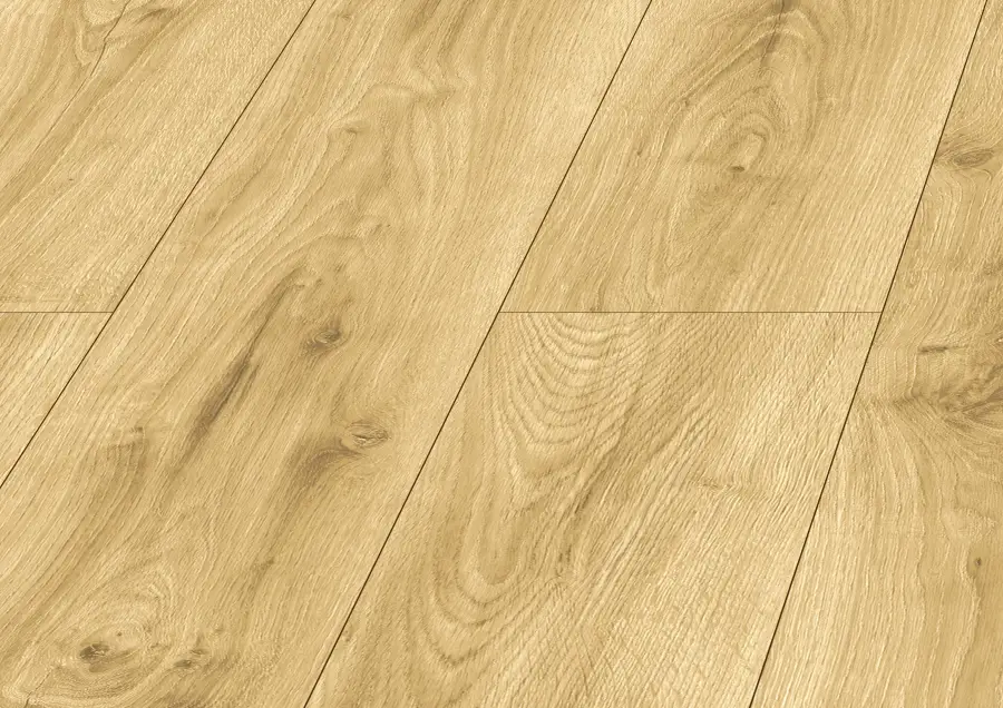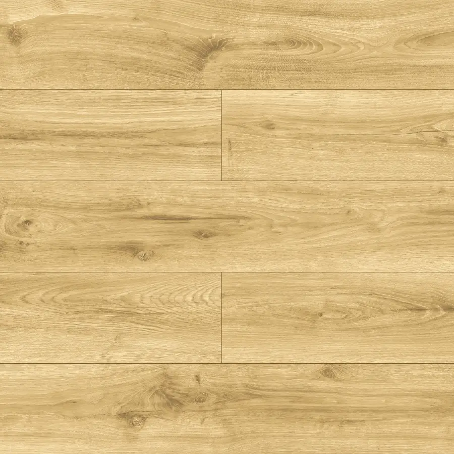 Panele w dekorze Dąb Wielkopolski cechują się naturalnym, ciepłym odcieniem drewna dębowego, który nadaje wnętrzom elegancji i przytulności. Dzięki 4-stronnej V-fudze, czyli delikatnym rowkom frezowanym na krawędziach każdej deski, podłoga wygląda jak autentyczna podłoga z litego drewna z wyraźnym podziałem szczelin między deskami. Ten zabieg optycznie poprawia głębię i strukturę podłogi, a jednocześnie podkreśla klasyczny styl przestrzeni i sprawia, że całe pomieszczenie wygląda bardziej naturalnie i luksusowo.
