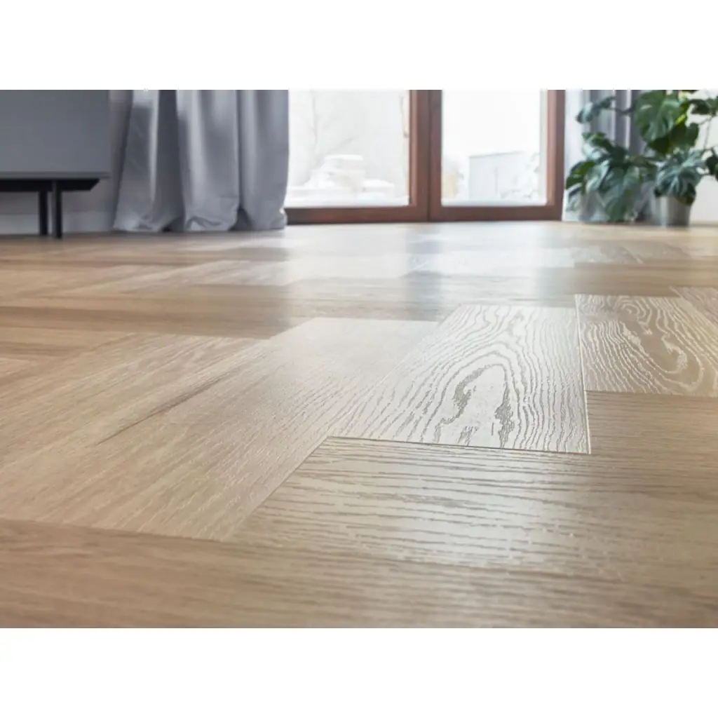 Panele winylowe Dąb Wembley z kolekcji Amaron Herringbone Mineral Dryback są kwintesencją nieprzemijającej elegancji. Jasny, naturalny odcień dębu w każdym wnętrzu tworzy uczucie ciepła i przestronności. Wyjątkowo niski opór cieplny tych paneli, wynoszący zaledwie 0,010 m²K/W, możliwy dzięki zastosowaniu technologii Mineral Dryback, zapewnia optymalne wykorzystanie systemów ogrzewania podłogowego, dzięki czemu podłogi te zapewniają przestrzenom w których są użyte jednocześnie stylowe wykończenie i efektywność energetyczną.