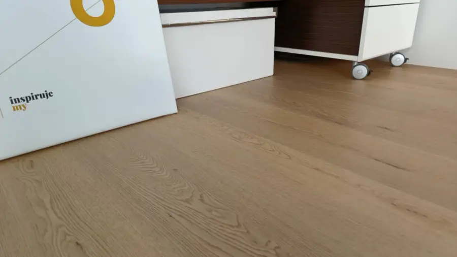 Delikatnie zaznaczone usłojenie podkreśla naturalny charakter drewna, nadając podłodze elegancki i harmonijny wygląd. Subtelna struktura wiernie odwzorowuje strukturę prawdziwego dębu, dzięki czemu podłoga prezentuje się autentycznie.