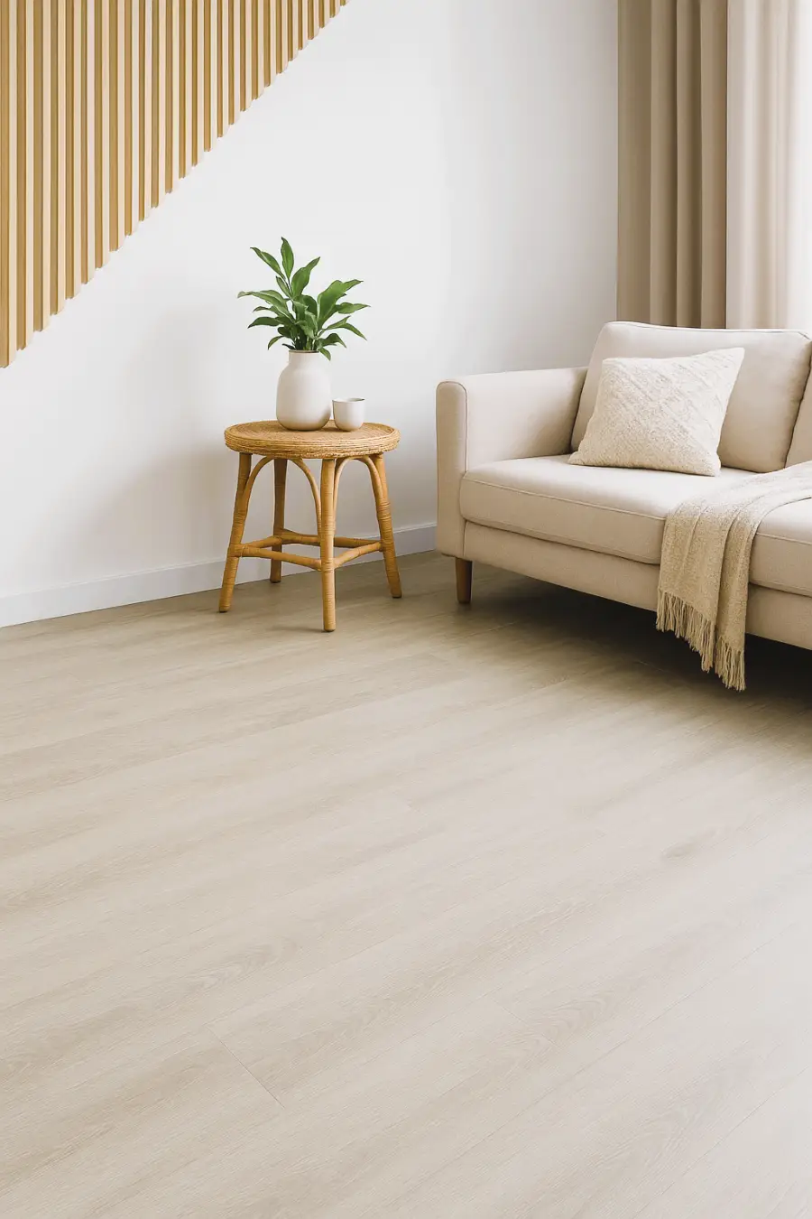 Uniwersalny kolor – połączenie jasnego szarego z delikatną nutą beżu sprawia, że podłoga pasuje do niemal każdej aranżacji wnętrz, od nowoczesnego minimalizmu po klasyczne wnętrza.
