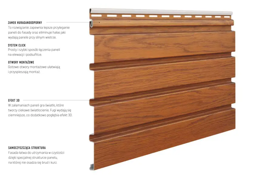 Fronto to nowatorskie rozwiązanie na elewację i podsufitkę. Produkt został stworzony w technologii podwójnej koekstruzji, dzięki której panele uzyskały lepsze właściwości mechaniczne: są bardziej odporne na zarysowania i promienie UV oraz mają trwalsze kolory. Profile Fronto są wodoodporne, lekkie, nie wymagają konswerwacji, a ich montaż jest łatwy i szybki. To gwarancja wielu lat bezproblemowego użytkowania.