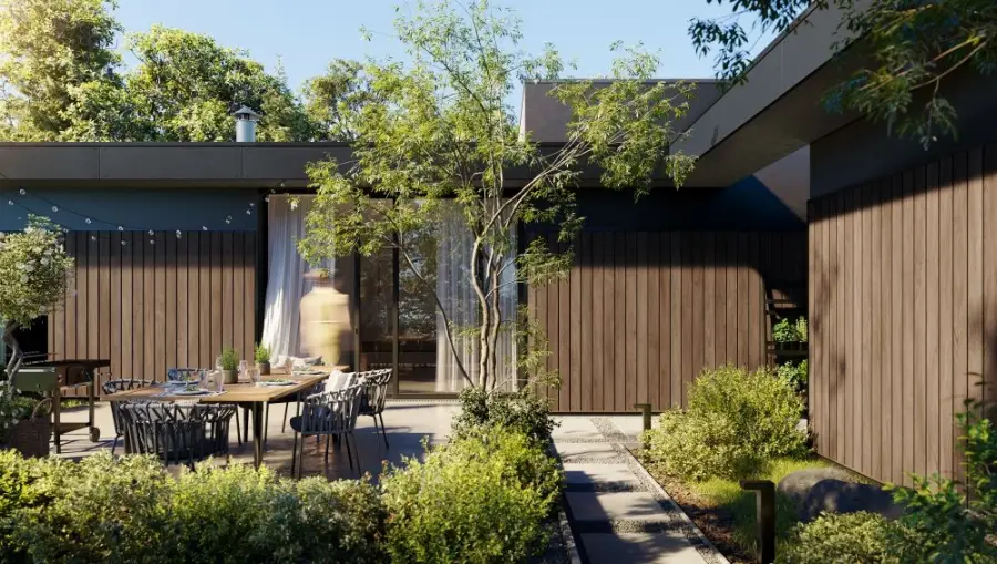 Dzięki komorowej budowie i wykorzystaniu wysokiej jakości materiałów, panele Solvo cechują się dużą wytrzymałością oraz odpornością na niekorzystne warunki zewnętrzne. Szeroka gama kolorystyczna oklein inspirowanych naturalnym drewnem, możliwość wyboru wariantu z fugą lub bez niej, a także opcja montażu w pionie lub poziomie dają dużą swobodę aranżacyjną. Ciemne fugi dodatkowo eskponują trójwymiarową strukturę paneli, nadając elewacji wyrazistości i głębi.