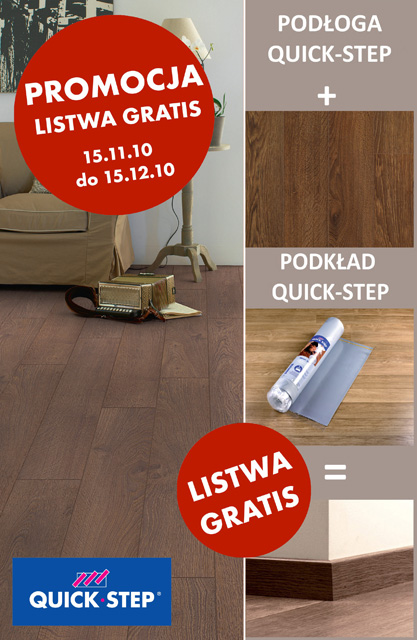 * do zakupu kazdej podłogi Quick_Step® (z wyjatkiem Classic i GO) wraz zoryginalnym podkładem Quick_Step®, otrzymasz standardowa listwe QSSKRGRATIS w proporcji 1M2 = 1MB (dokładne warunki promocji dostepne u sprzedawcy)