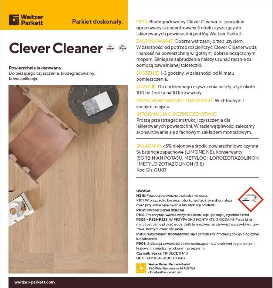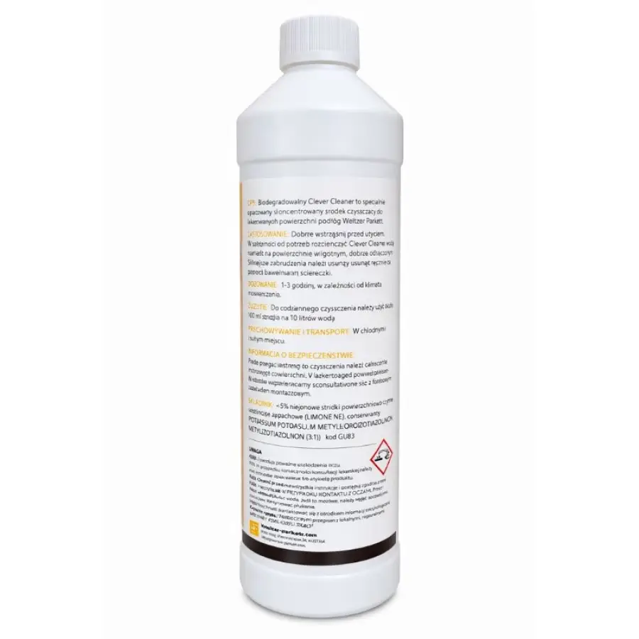 Biodegradowalny Clever Cleaner do lakierowanych podłóg Weitzer Parkett to specjalnie opracowany, skoncentrowany środek czyszczący przeznaczony do codziennej pielęgnacji i skutecznego czyszczenia lakierowanych powierzchni drewnianych. Formuła została stworzona z myślą o podłogach Weitzer Parkett, dzięki czemu preparat skutecznie usuwa zabrudzenia, nie naruszając warstwy lakieru ani naturalnego wyglądu drewna.